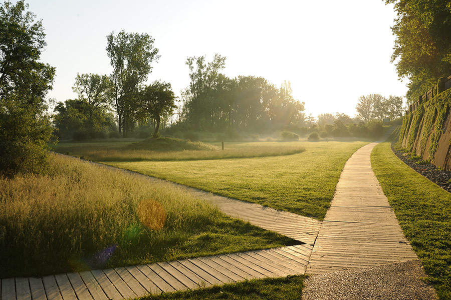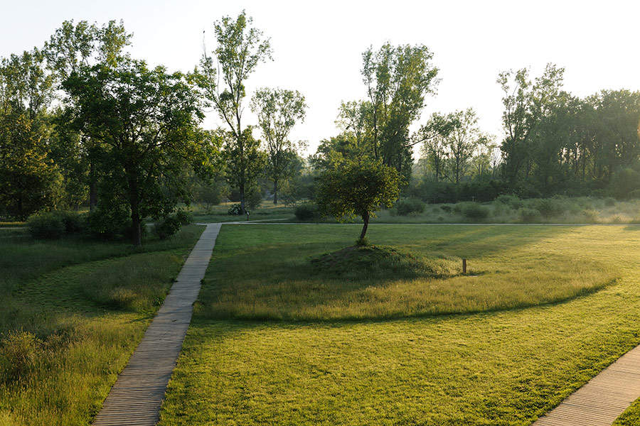 一座人行天桥将林荫大道与河流横向连接起来,可以看到树冠和茂密的树叶。最后,环形步道,一个周长1公里的完美圆圈,环绕并突出了杨树林及其兰花草地的重要性。