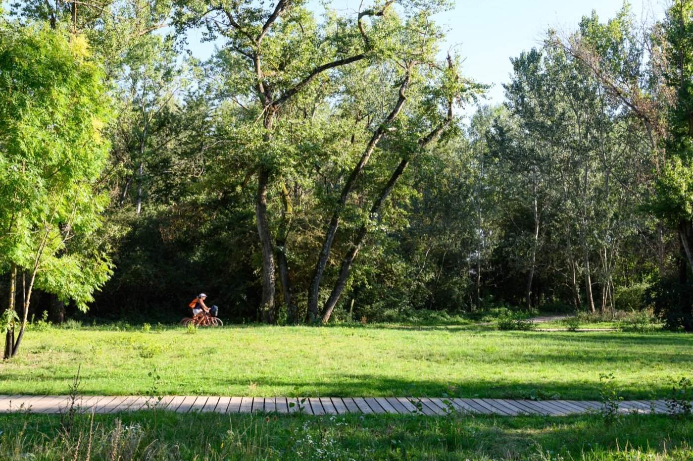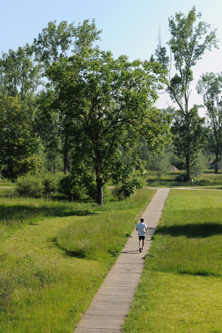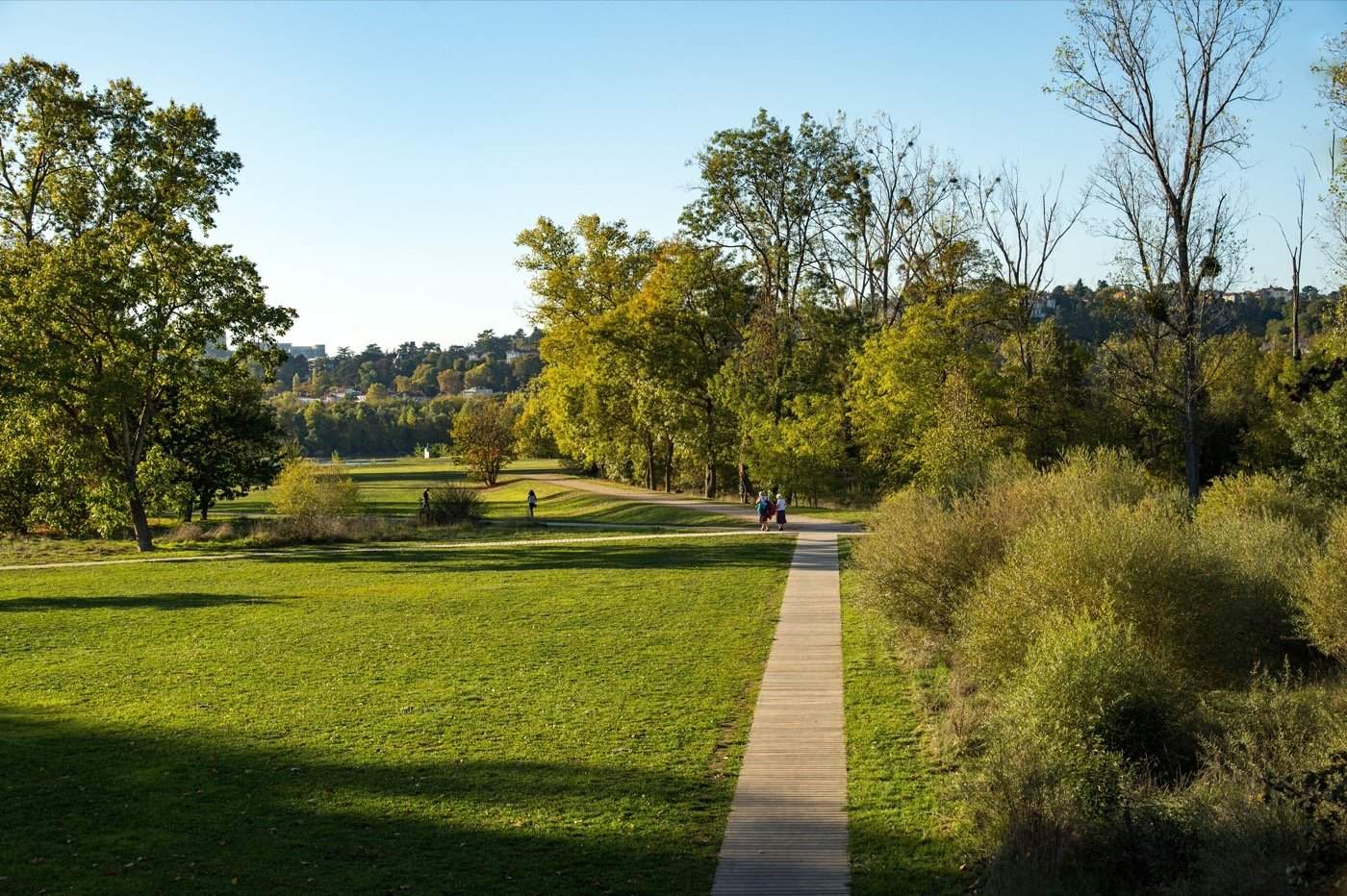 Along its length, the Rhône can be seen and approached via a simple dirt path with windows onto the river. The metropolitan cycling path along the Rhône takes place on a central route along the trees. The inaccessible heart of the woodlands can be seen from a new, slightly above-ground, perfectly straight and graded line of use, linking the two entrances to the park: the hectometric walk, graded every 100 metres.