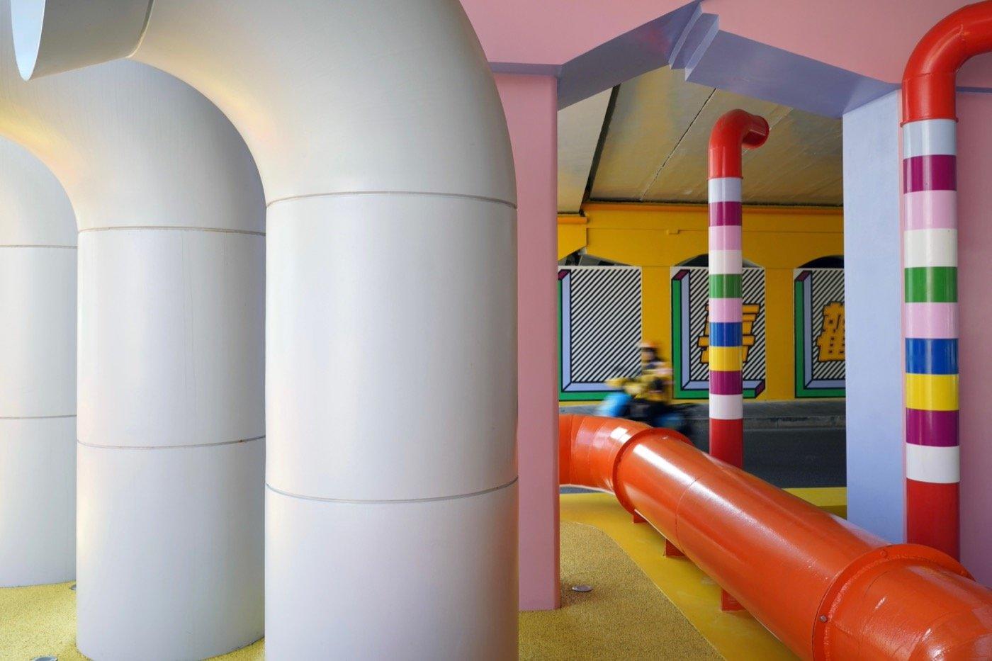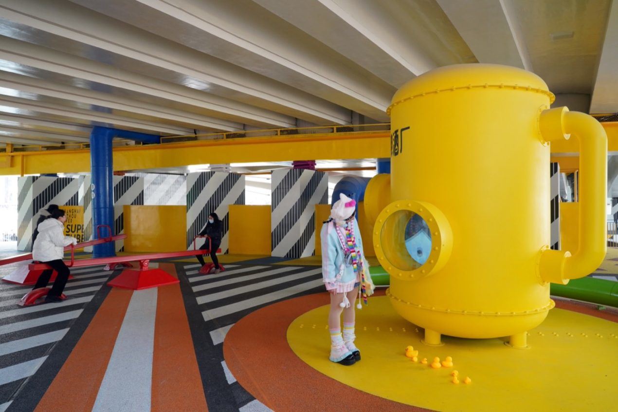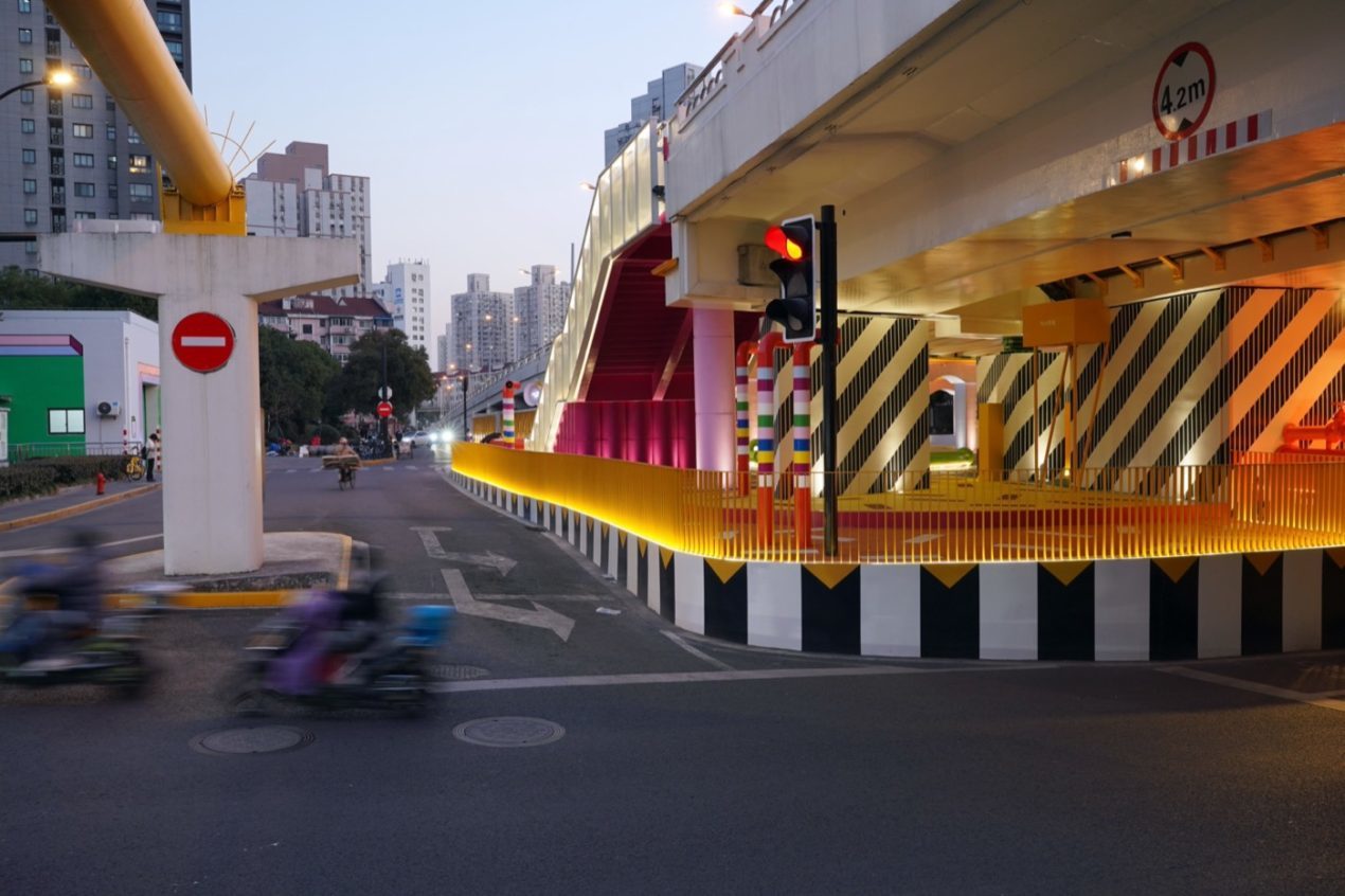 Based on this, the purpose of this transformation is not only to provide convenient transportation for daily travel but also to integrate local cultural atmosphere, achieve the cultural metamorphosis of infrastructure, and create a slow walking space on the banks of the Suzhou River that is friendly for people of all ages. Taking inspiration from a yellow municipal gas pipe that remained on-site, the design team used the combination of “pipes” and “colors” as a clever way to break through the problem. The former is a representative element of the industrial history along the Suzhou River and even in modern Shanghai, while the latter is the best choice to change the shady and gloomy atmosphere of the space under the bridge.