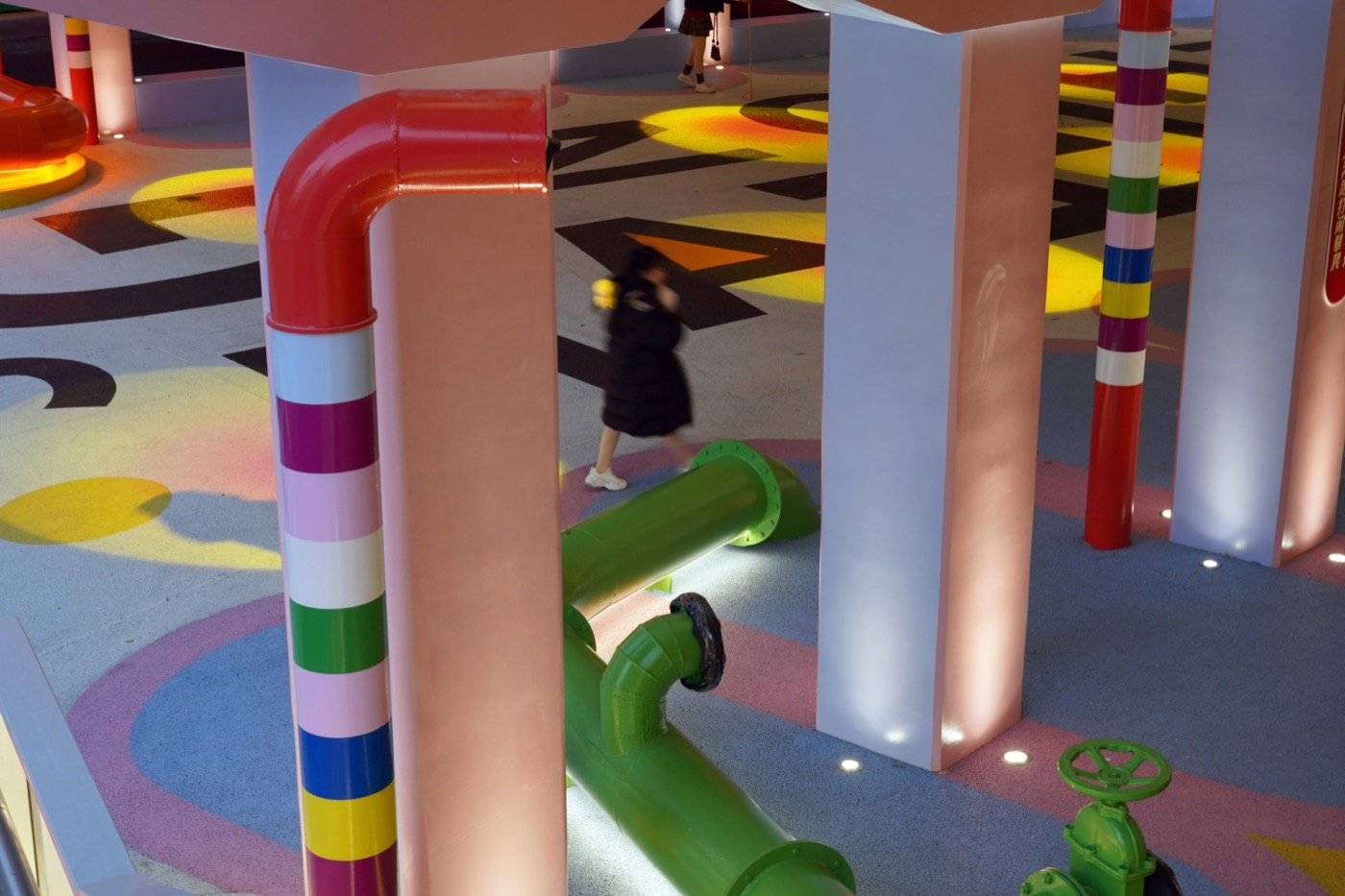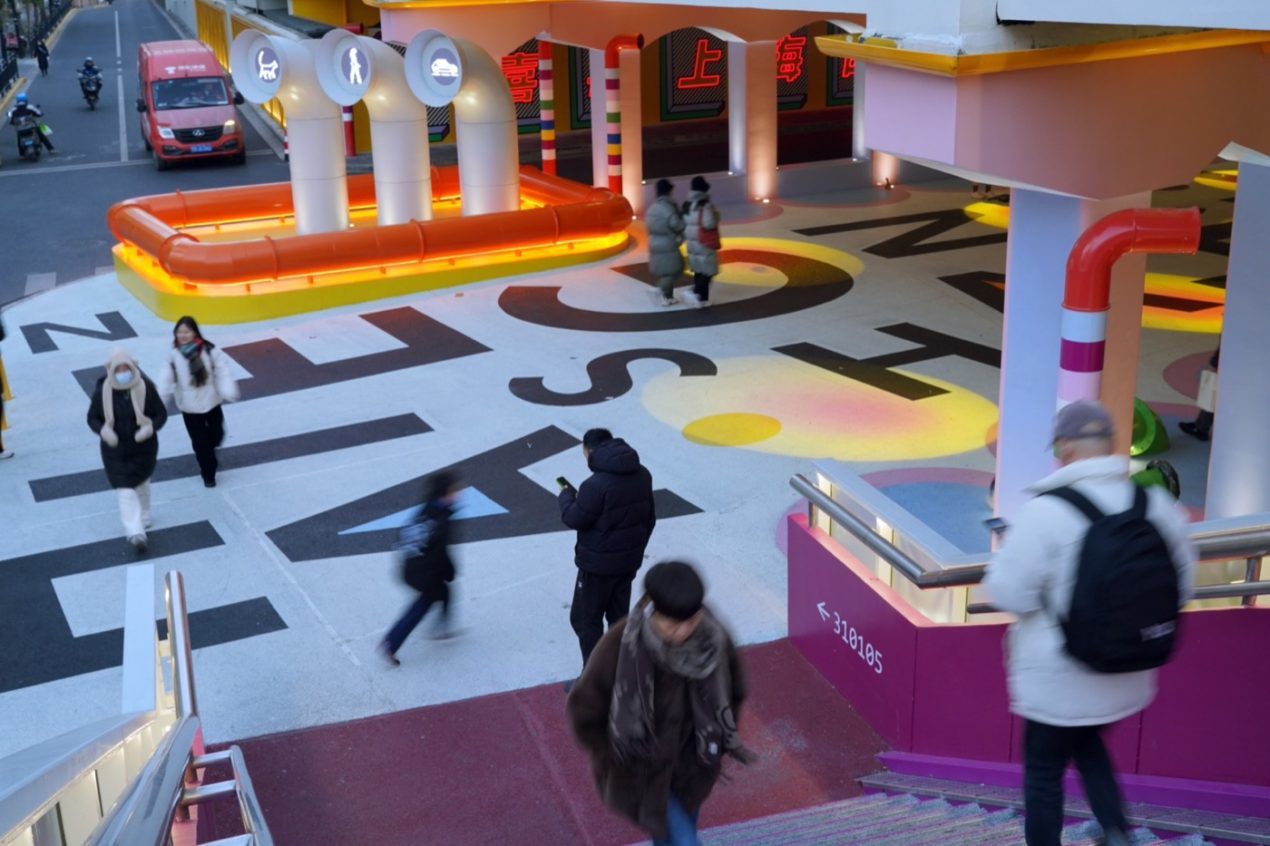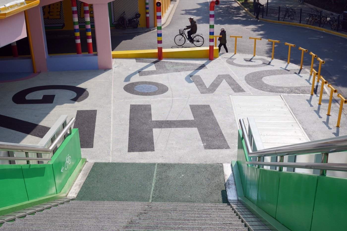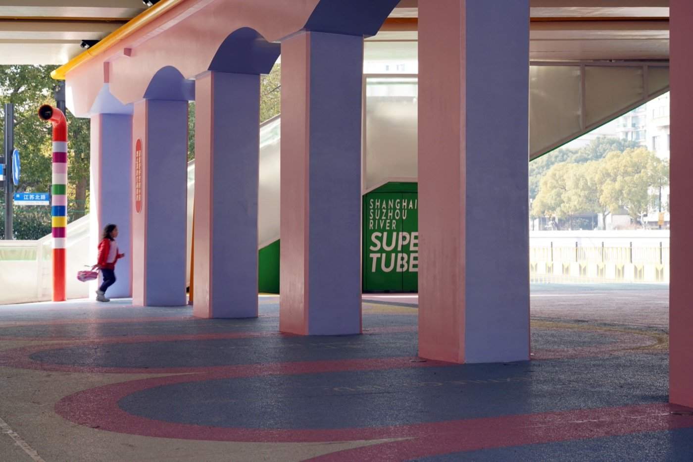 To recreate the imprint of factory life in the communities along the Suzhou River in Shanghai, the design team specially purchased a batch of discarded industrial pipelines and transformed them into safety fences, seats, and surprising small nodes in the site. The space under the bridge was wrapped with curved steel plates, security monitoring was decorated with colored steel pipes, and non-motorized vehicle barriers were replaced with yellow cylinders. The element of “pipeline” becomes an ubiquitous design vocabulary in the site, and these elements not only have a sculptural sense and functionality but also pay tribute to the silhouette of Shanghai’s industrial history, such as storage tanks, paint cans, beer barrels, and vacuum tubes. The large-scale seesaw designed with industrial elements and CCTV cameras cleverly wrapped in Christmas-colored sprayed steel pipes have been loved by users of all ages since their opening. Bold color design is a key technique to change the original dim atmosphere of the site under limited conditions. When the design team packaged the pipes with industrial memory symbolism, they used geometric patterns and bright colors. The dramatic artistic effect formed by these patterns pays tribute to the timeless classic “Memphis style”, which represents the attitude of daring imagination, breaking conventions, and fearless optimism that we hope to convey to users through our work. We not only put a lot of effort into colorful graffiti but also combined various texts with graffiti, including Shanghai slang, project logos, ID codes of Changning and Putuo districts, important names of industrial plants, and deliberately preserved factory slogans. The design of the texts also caters to the needs of young people to check in and provides them with space and materials for their photo-sharing activities. The rough industrial pipelines and language graffiti in local dialects also create different effects. The ground of the pedestrian passage has special patterns, which disrupt and rearrange the English words “SHANGHAI”, “SUZHOU RIVER”, and “INDUSTRY” to form creative nodes when imprinted on the ground.