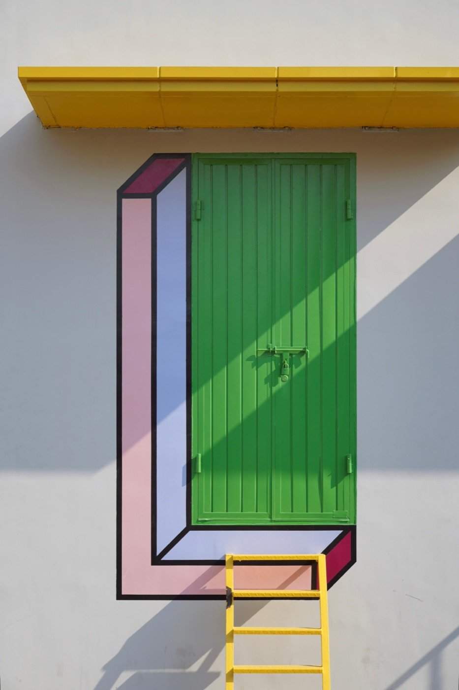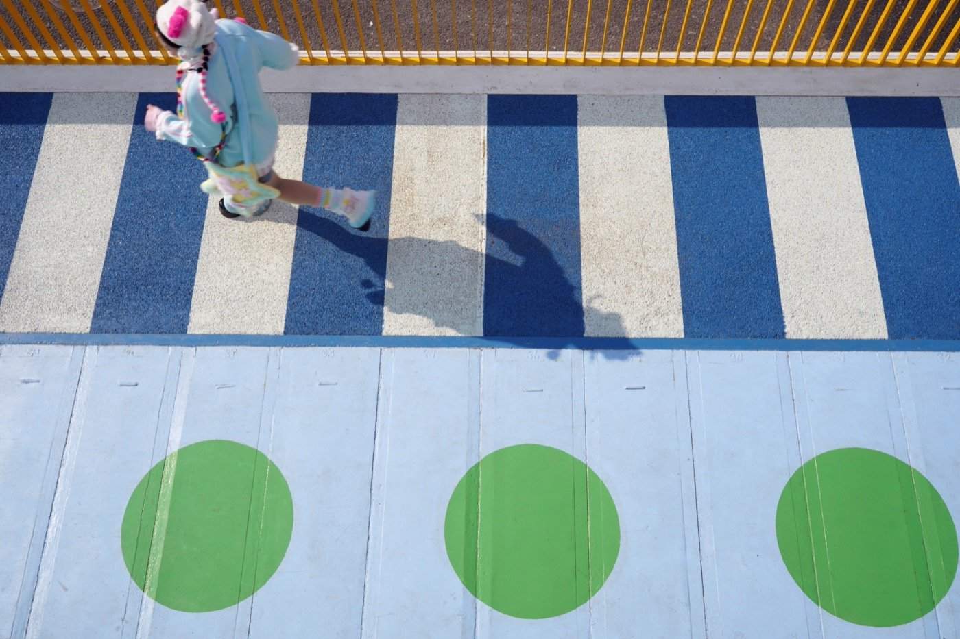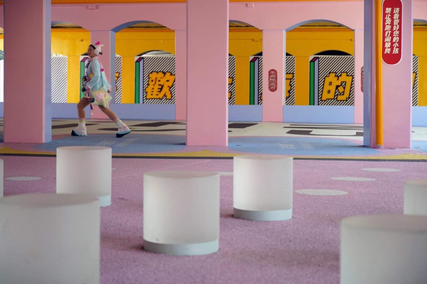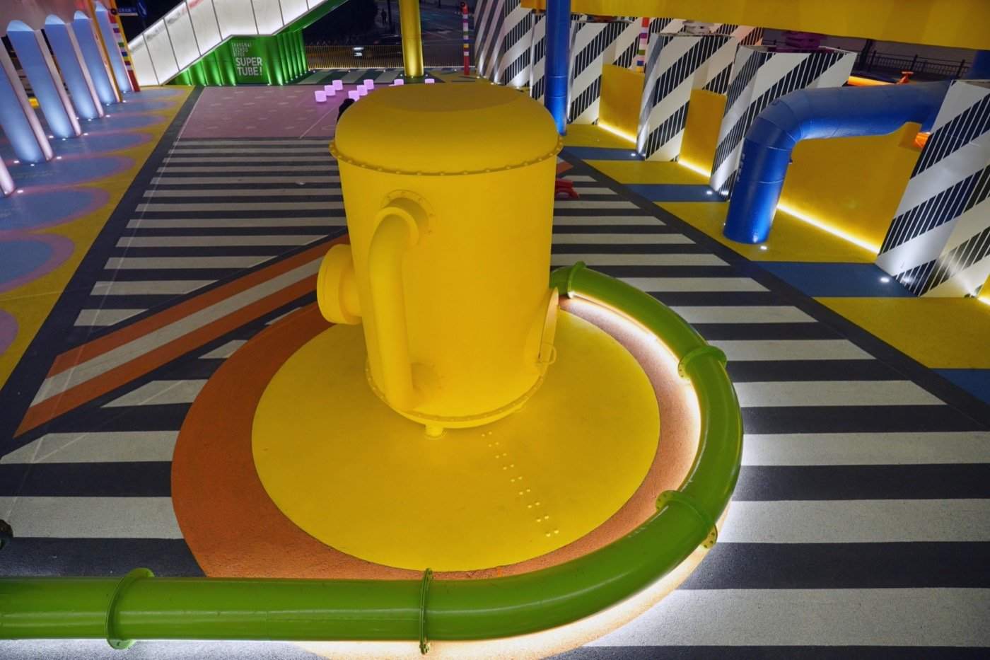 To recreate the imprint of factory life in the communities along the Suzhou River in Shanghai, the design team specially purchased a batch of discarded industrial pipelines and transformed them into safety fences, seats, and surprising small nodes in the site. The space under the bridge was wrapped with curved steel plates, security monitoring was decorated with colored steel pipes, and non-motorized vehicle barriers were replaced with yellow cylinders. The element of “pipeline” becomes an ubiquitous design vocabulary in the site, and these elements not only have a sculptural sense and functionality but also pay tribute to the silhouette of Shanghai’s industrial history, such as storage tanks, paint cans, beer barrels, and vacuum tubes. The large-scale seesaw designed with industrial elements and CCTV cameras cleverly wrapped in Christmas-colored sprayed steel pipes have been loved by users of all ages since their opening. Bold color design is a key technique to change the original dim atmosphere of the site under limited conditions. When the design team packaged the pipes with industrial memory symbolism, they used geometric patterns and bright colors. The dramatic artistic effect formed by these patterns pays tribute to the timeless classic “Memphis style”, which represents the attitude of daring imagination, breaking conventions, and fearless optimism that we hope to convey to users through our work. We not only put a lot of effort into colorful graffiti but also combined various texts with graffiti, including Shanghai slang, project logos, ID codes of Changning and Putuo districts, important names of industrial plants, and deliberately preserved factory slogans. The design of the texts also caters to the needs of young people to check in and provides them with space and materials for their photo-sharing activities. The rough industrial pipelines and language graffiti in local dialects also create different effects. The ground of the pedestrian passage has special patterns, which disrupt and rearrange the English words “SHANGHAI”, “SUZHOU RIVER”, and “INDUSTRY” to form creative nodes when imprinted on the ground.