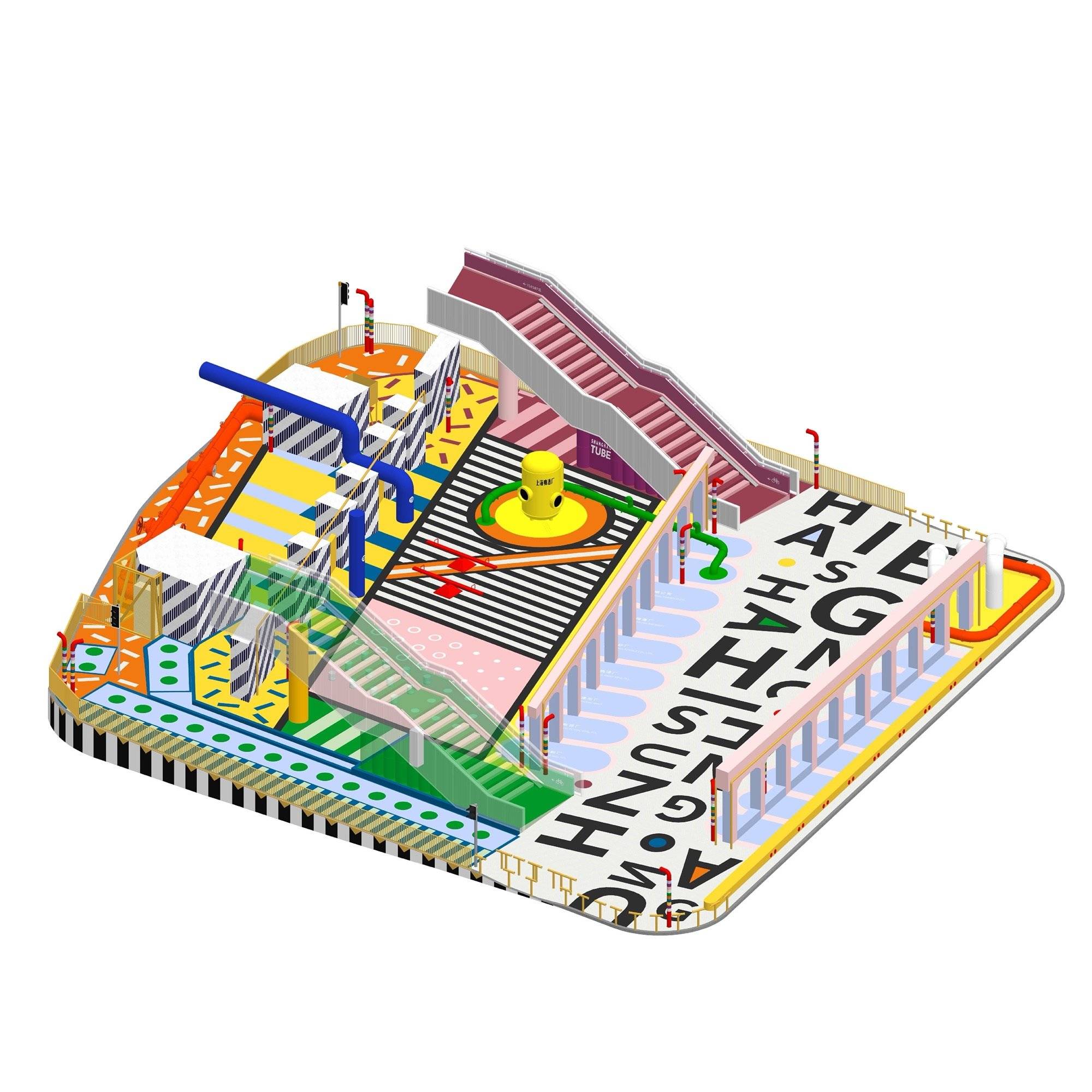 为了在上海苏州河沿岸社区重现工厂生活的印记,设计团队专门购买了一批废弃的工业管道,并将其改造成安全围栏、座椅和令人惊讶的小节点。桥下的空间用弯曲的钢板包裹,安全监控用彩色钢管装饰,非机动车护栏用黄色圆柱体代替。“管道”元素成为现场无处不在的设计词汇,这些元素不仅具有雕塑感和功能性,还向上海工业历史的轮廓致敬,如储罐、油漆罐、啤酒桶和真空管。这款大型跷跷板设计有工业元素和巧妙包裹在圣诞色喷涂钢管中的闭路电视摄像头,自开业以来一直受到各个年龄段用户的喜爱。大胆的色彩设计是在有限条件下改变场地原有昏暗氛围的关键技术。当设计团队用工业记忆符号包装管道时,他们使用了几何图案和明亮的颜色。这些图案所形成的戏剧性艺术效果向永恒的经典“孟菲斯风格”致敬,它代表了我们希望通过我们的工作传达给用户的大胆想象、打破常规和无所畏惧的乐观态度。我们不仅在丰富多彩的涂鸦上付出了很多努力,还将各种文字与涂鸦相结合,包括上海俚语、项目标志、长宁和普陀区的身份证号码、工业厂房的重要名称以及精心保存的工厂标语。文本的设计还满足了年轻人办理登机手续的需求,并为他们的照片分享活动提供了空间和材料。粗糙的工业管道和当地方言的语言涂鸦也产生了不同的效果。人行通道的地面有特殊的图案,当印在地面上时,会打乱和重新排列英文单词“SHANGHAI”、“SUZHOU RIVER”和“INDUSTRY”,形成创意节点。