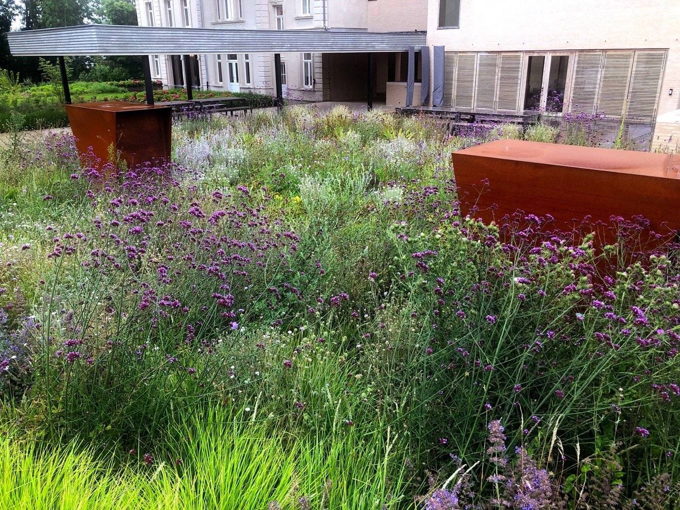 There are actually two types of plants used in this system. Groundcovering and self-sowing species. The first take care of the lateral covering structure, the letter shape the vertical image. This withered vertical image is also present in the winter and makes the image at that time of the year interesting in a very specific way.