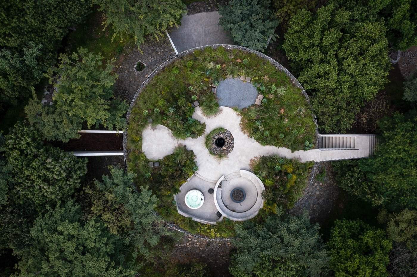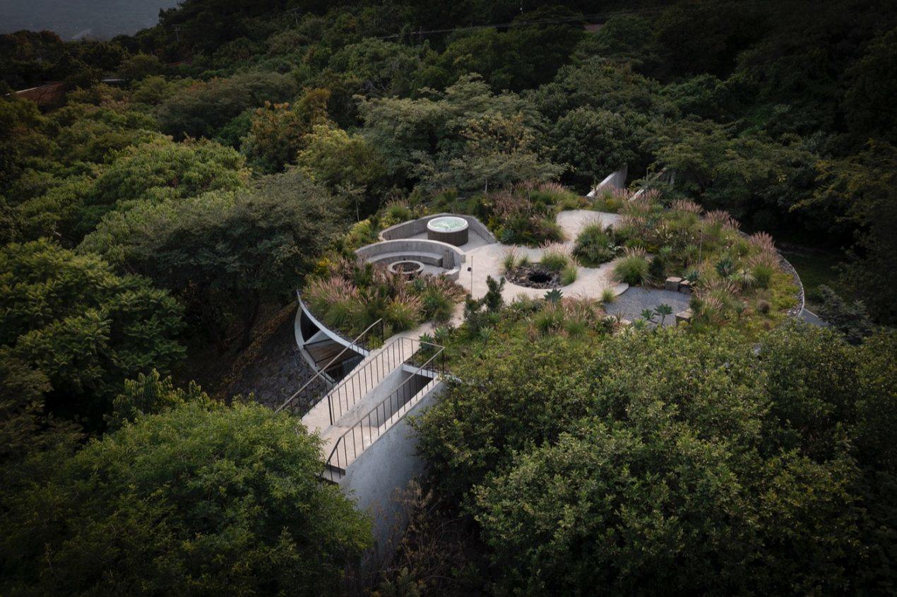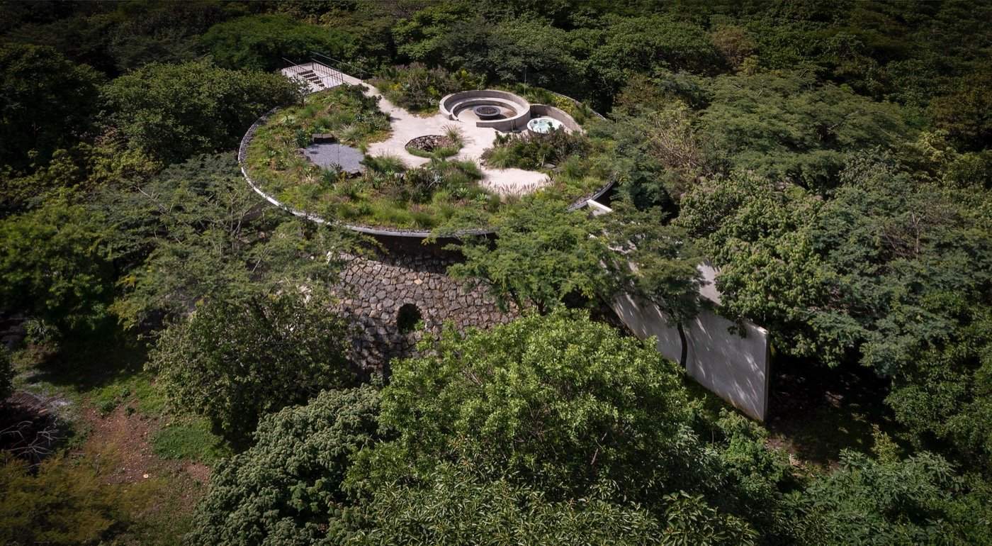 The project consists of a circular building built with volcanic stone that seeks to represent a mountain, in which the vegetation is born at the top, overflows and contains it. The entrance venerates the idea of entering the interior of the mountain through a tunnel that takes the user on a circular route through the spaces intended for the well-being of the body. With the mood cleansed, the user re-emerges on a staircase that takes him or her to a new lush landscape. In the center, a round skylight is imposed with the help of the sun and the water that filters below, the rainwater falls through this window like a sky-eye, collecting it and storing it inside a cistern prepared to be reused as irrigation.