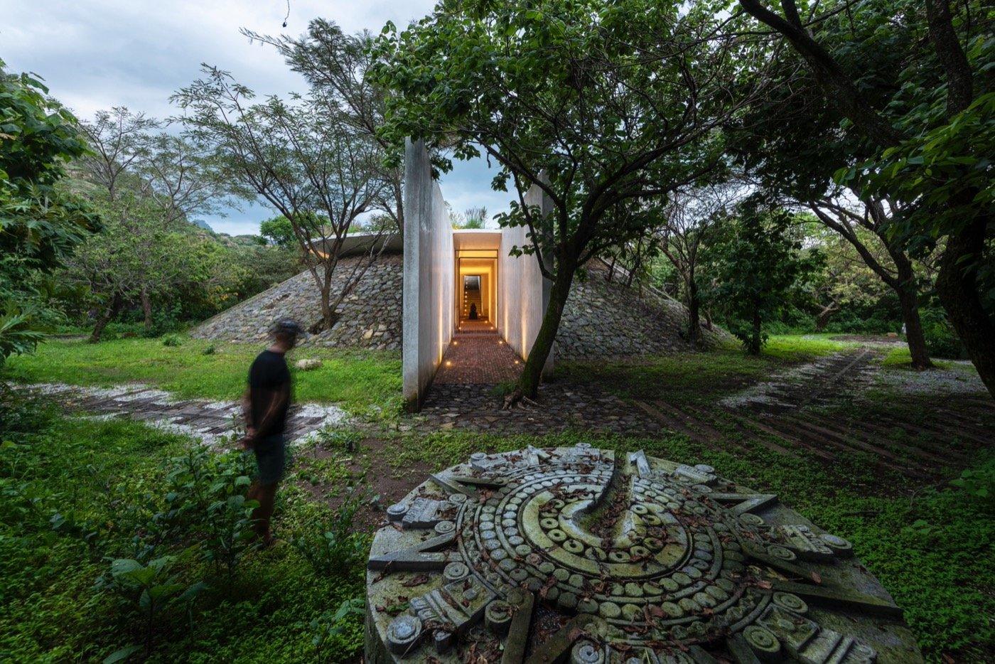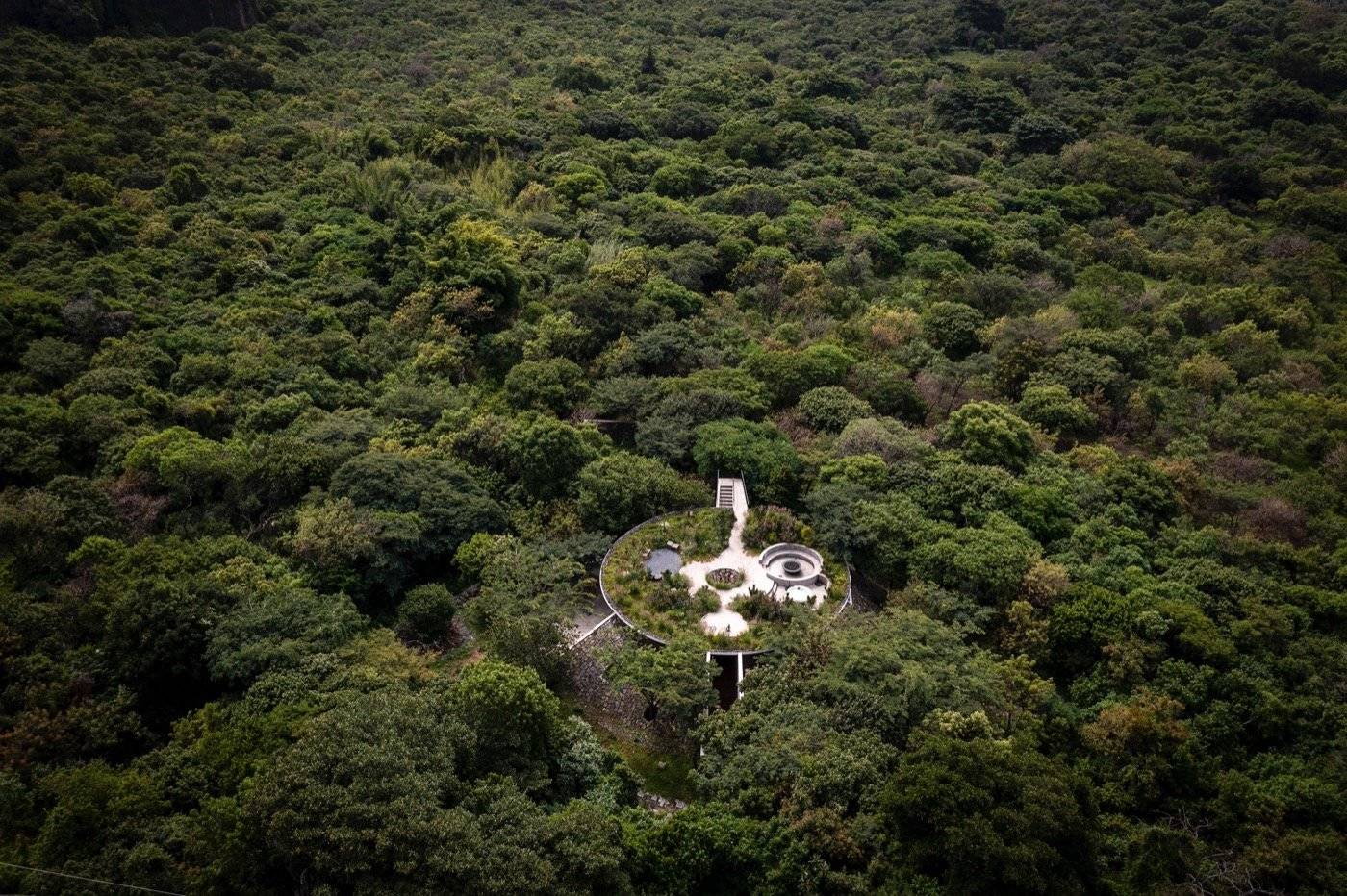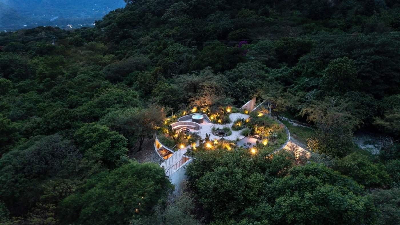 The project consists of a circular building built with volcanic stone that seeks to represent a mountain, in which the vegetation is born at the top, overflows and contains it. The entrance venerates the idea of entering the interior of the mountain through a tunnel that takes the user on a circular route through the spaces intended for the well-being of the body. With the mood cleansed, the user re-emerges on a staircase that takes him or her to a new lush landscape. In the center, a round skylight is imposed with the help of the sun and the water that filters below, the rainwater falls through this window like a sky-eye, collecting it and storing it inside a cistern prepared to be reused as irrigation.