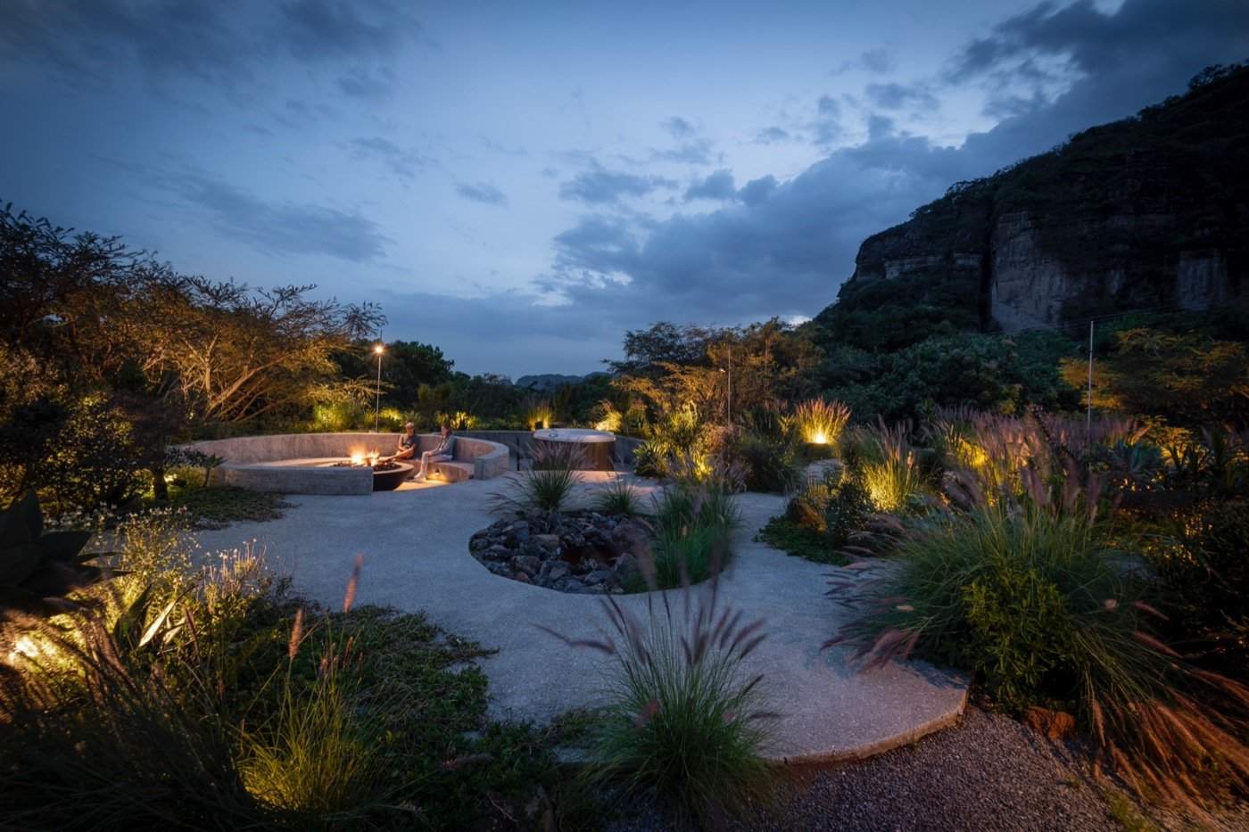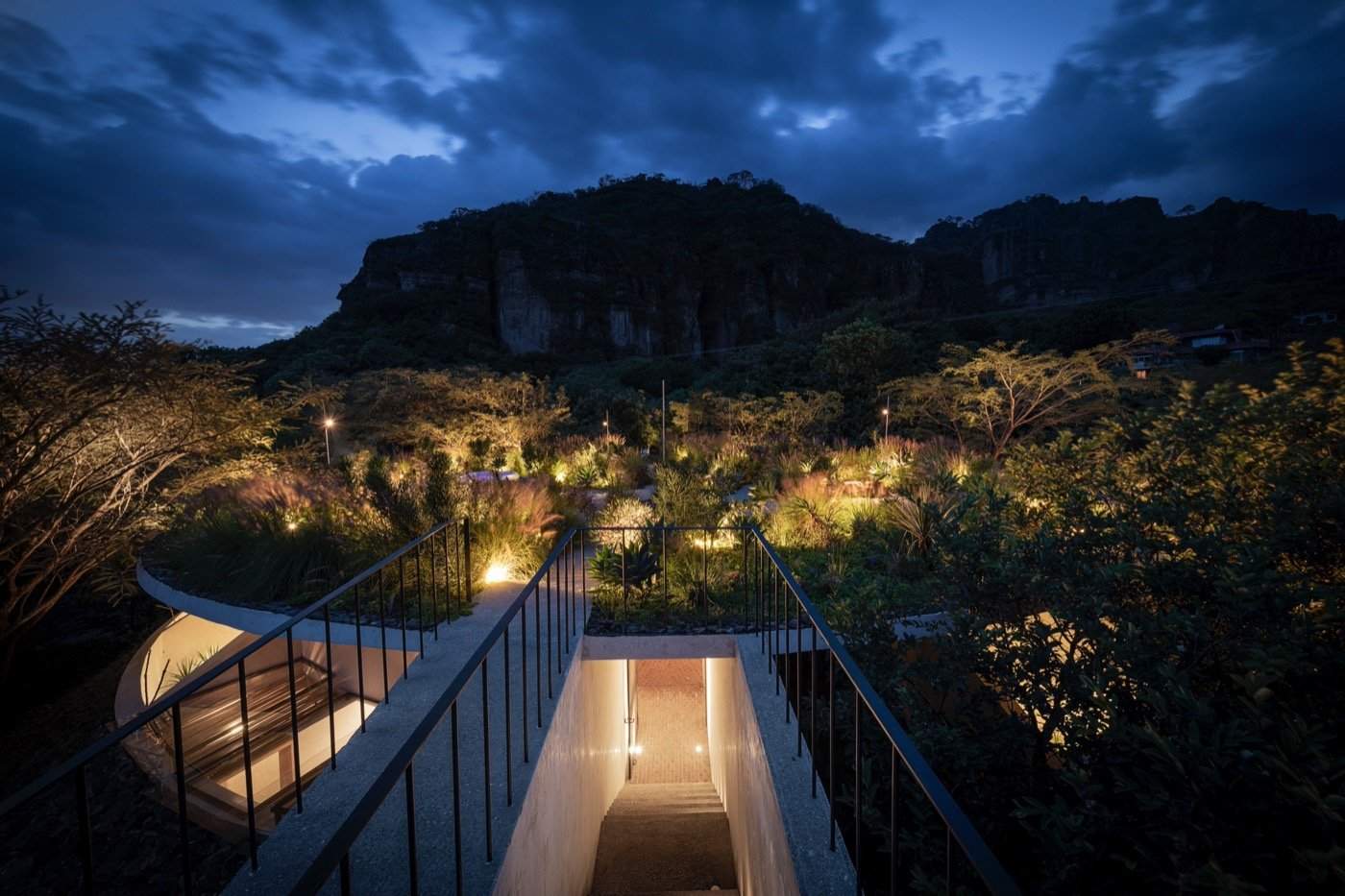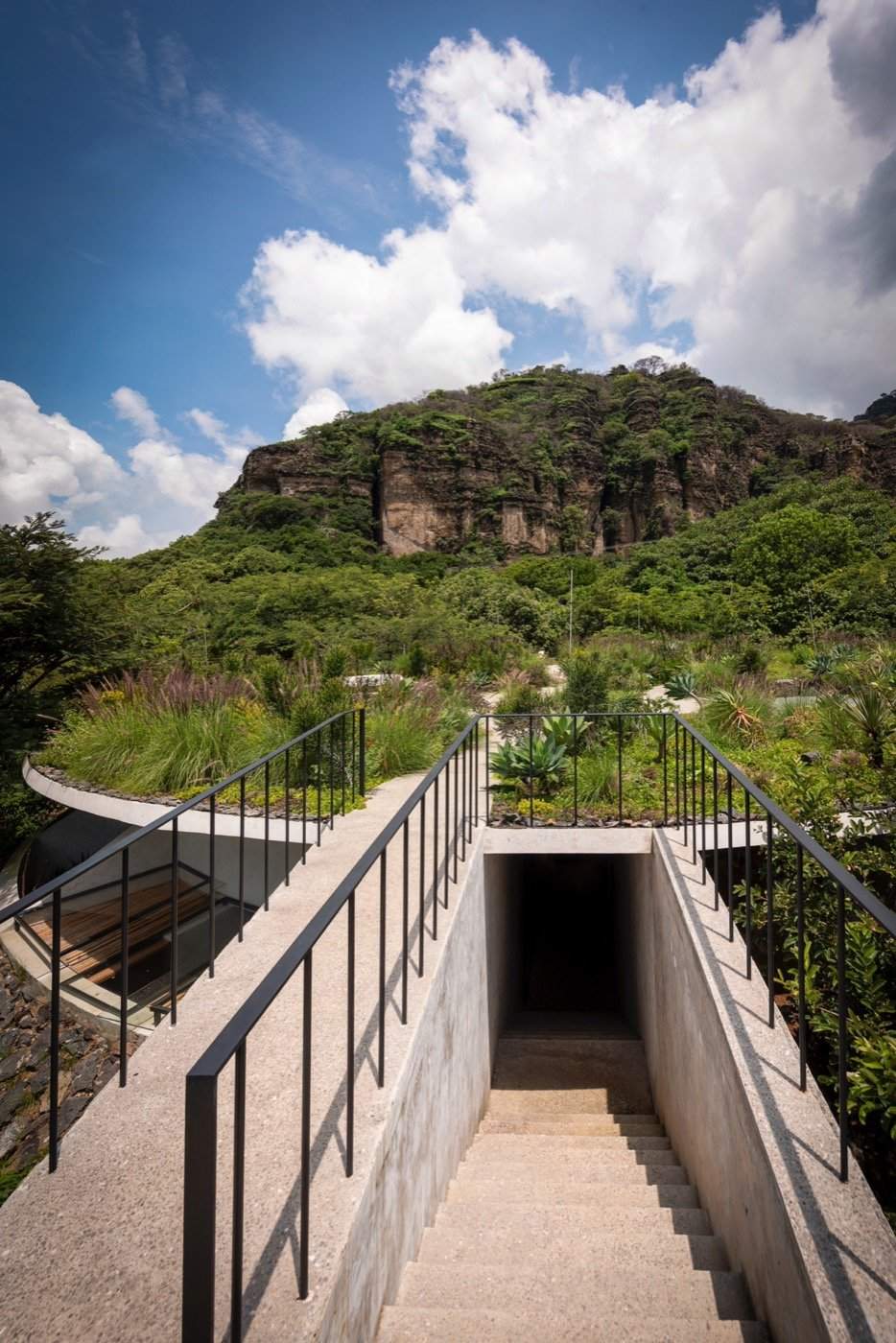 与自然的和谐共生:Tepoztlan水疗中心项目最显著的亮点在于其对环境的尊重与融合。建筑设计并非简单地将人造结构置于自然之中,而是试图模拟自然,打造一个与周围环境融为一体的“山体”。这种设计理念体现在材料的选择上,火山石的运用不仅呼应了当地的自然地貌,也赋予了建筑一种原始、质朴的氛围。此外,项目对自然元素的巧妙利用也令人印象深刻,例如天窗的设计,通过收集雨水并用于灌溉,实现了资源的循环利用,体现了可持续设计的理念,也展现了设计师对当地生态系统的深刻理解。