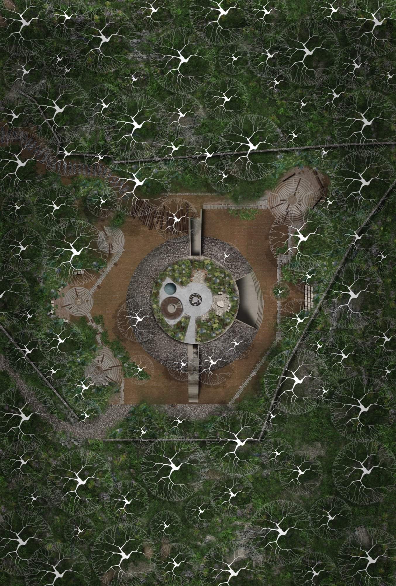 该项目由一座用火山石建造的圆形建筑组成,旨在代表一座山,植被在山顶生长,溢出并包含在其中。入口尊重通过隧道进入山内的想法,隧道将用户带到圆形路线上,穿过为身体健康而设的空间。随着情绪的净化,用户重新出现在楼梯上,将他或她带到一个新的郁郁葱葱的景观。在中心,一个圆形天窗在阳光和下面过滤的水的帮助下,雨水像天眼一样从窗户落下,收集并储存在一个准备重新用作灌溉的蓄水池里。