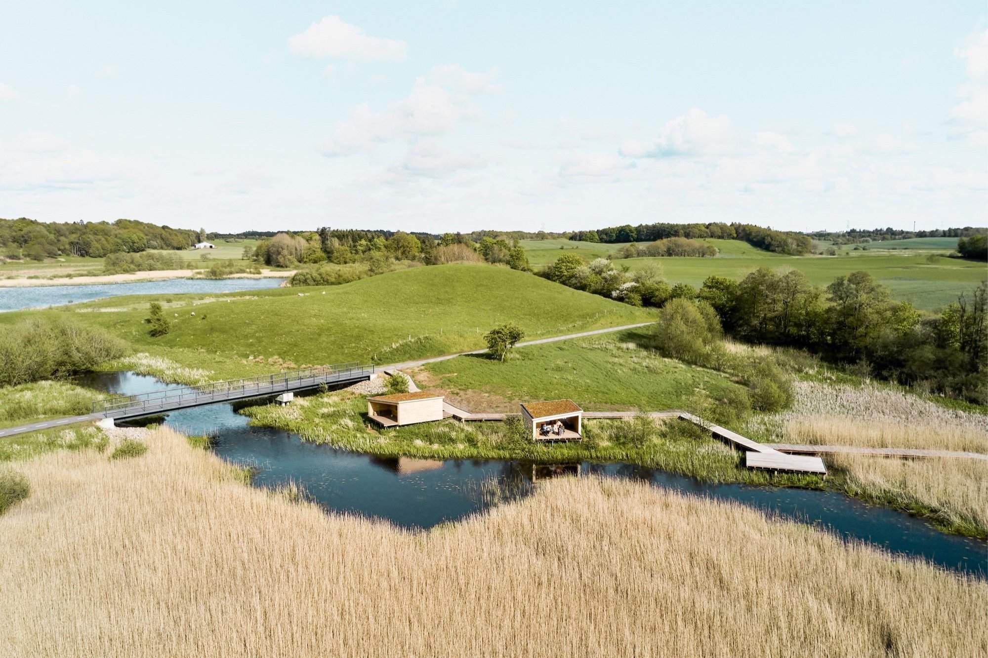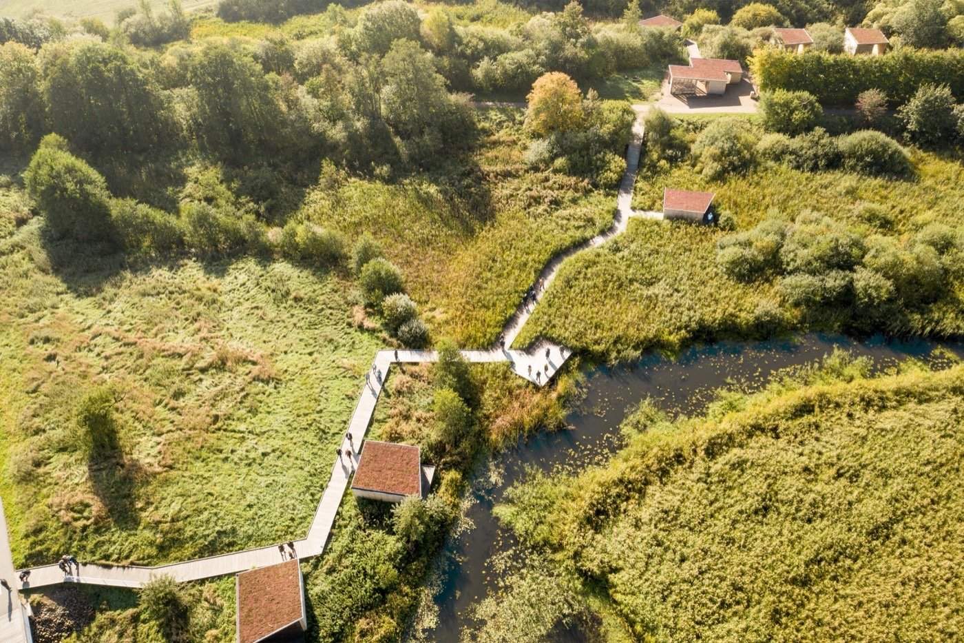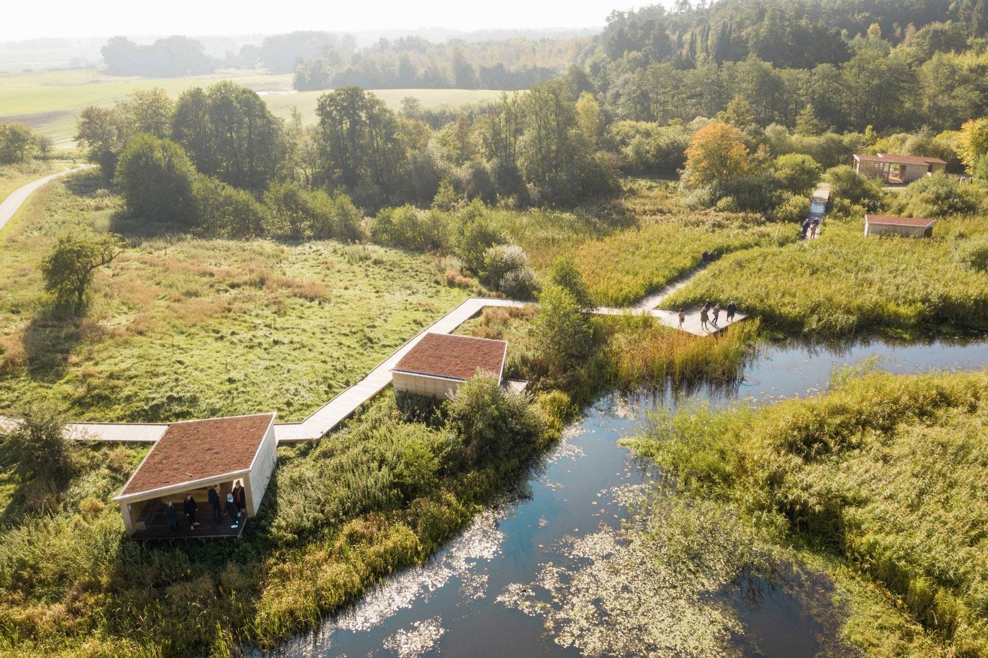 推动该项目的建筑理念是创造一条让用户沉浸在自然世界中的通道,同时确保对环境的影响最小。步道本身的设计遵循了土地的自然轮廓,穿过不同的生态区。一路上,一系列庇护所提供了休息或过夜的地方,每个庇护所的设计都与特定的环境相协调——无论是在开阔的田野里、树林里还是湿地附近。这些建筑主要由木材建造,必要时用高跷支撑,既环保又受欢迎