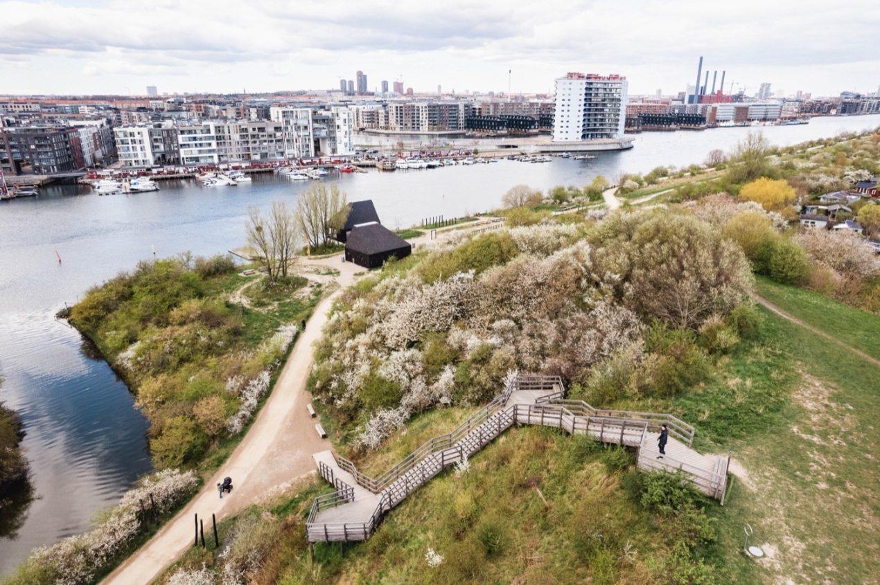 Havneslusen is a unique addition to Nature Park Amager, located on the cusp of the city and surrounded by an organically developed neighborhood of houseboats and the “Nokken” garden community. Here, a floating platform on the water provides access for kayaks and small boats, inviting visitors to explore the harbor. This space is is a versatile gathering place that offers something distinct from any other location in the park or city. Whether used for picnics, educational activities, or simply a place to pause, the covered area is a flexible environment designed for varied uses. The staircase embedded in the terrain behind Havneslusen leads to a stunning viewpoint, offering a serene resting place with panoramic views from the hilltop.