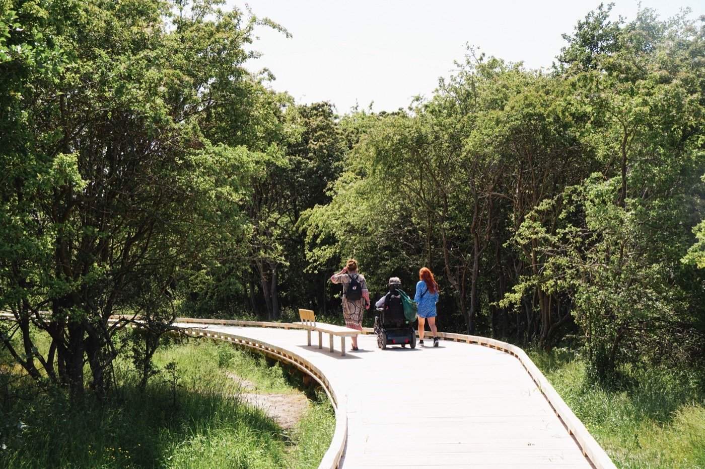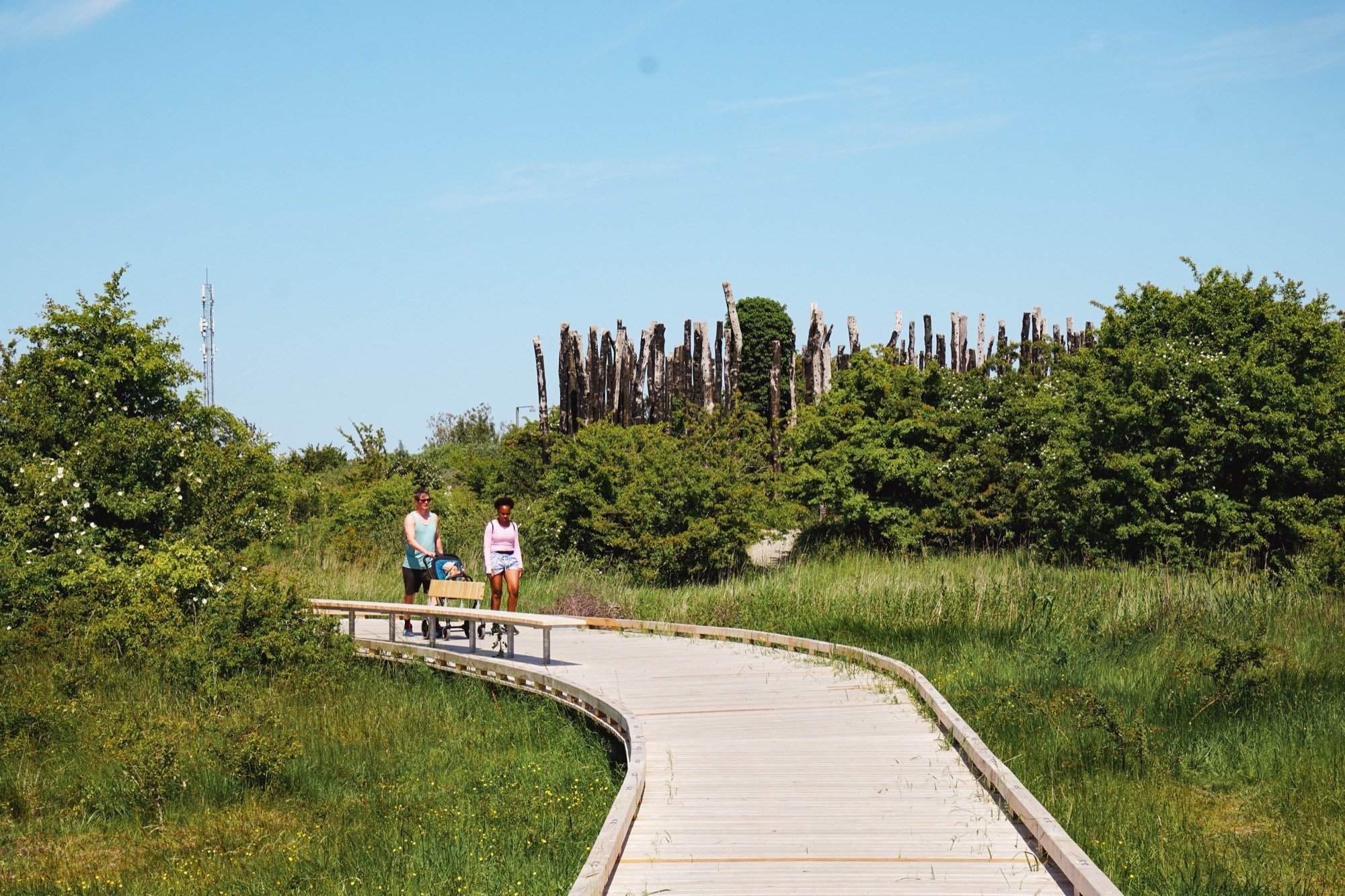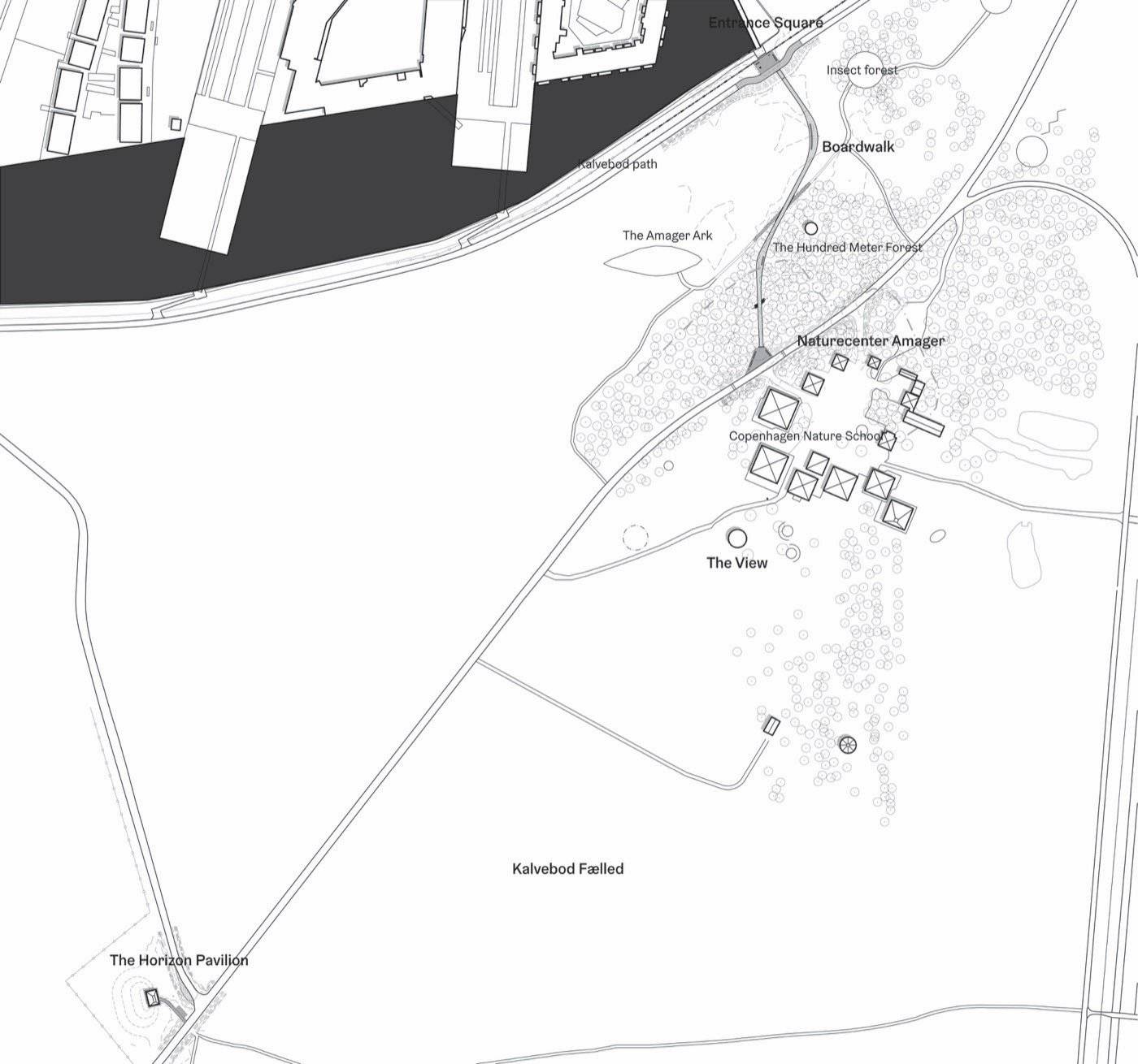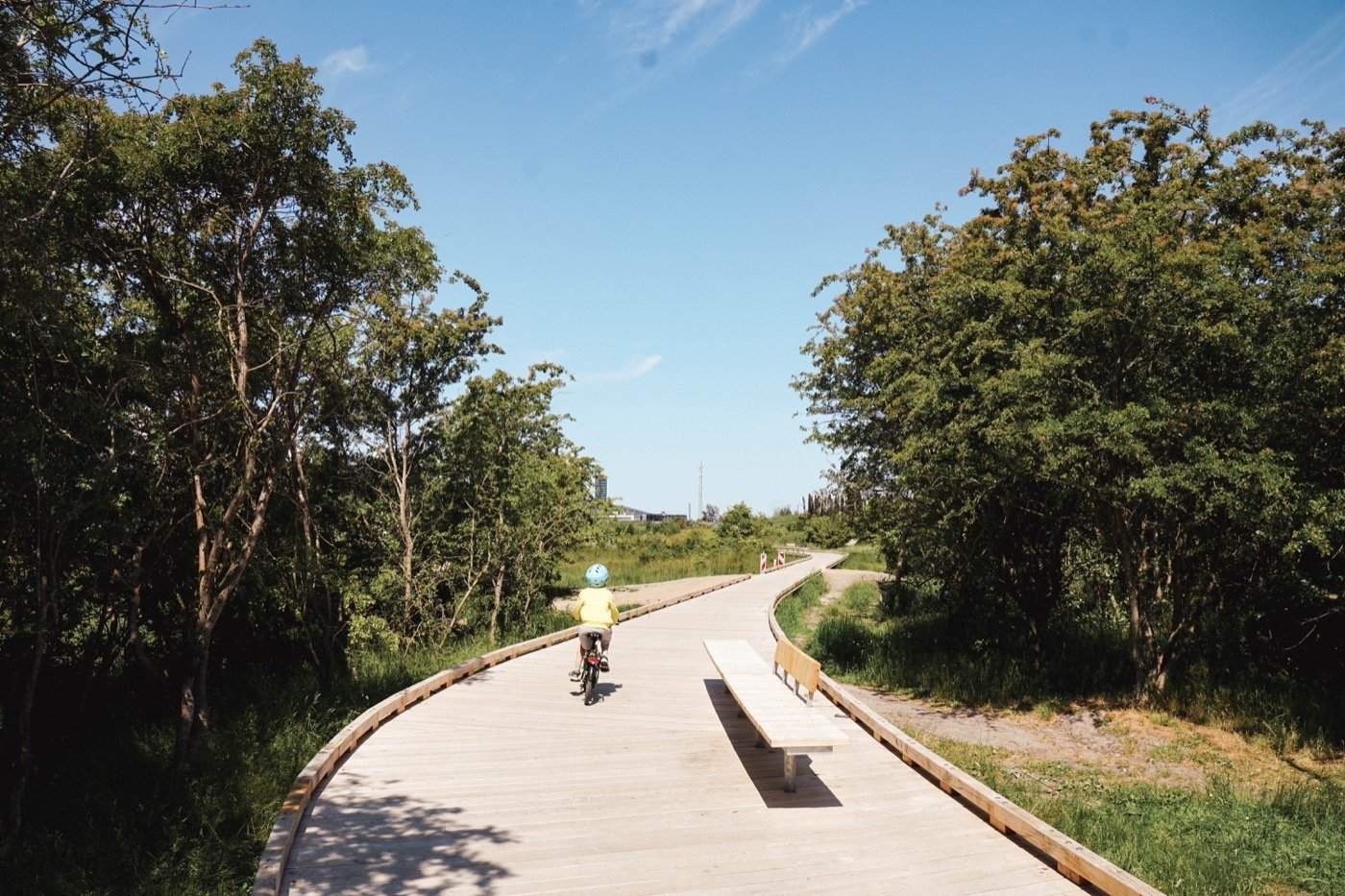 Asger Jorns Allé serves as the primary entrance to the park, creating a dynamic and visible gateway that welcomes visitors. This entrance is marked by a new observation tower, which stands as a beacon along the city’s edge, visible from the nearby metro station. The park’s entrance pathway meanders through dense, bushy vegetation and marshy terrain, allowing visitors to experience the natural environment without disturbing it. A winding boardwalk provides different perspectives of the wilderness, leading to a raised viewpoint above the treetops. From this vantage point, visitors can orient themselves within the landscape, while the path below opens new opportunities for exploration. The boardwalk connects seamlessly to the park’s broader network of trails, inviting further exploration of Nature Park Amager’s rich natural landscape.