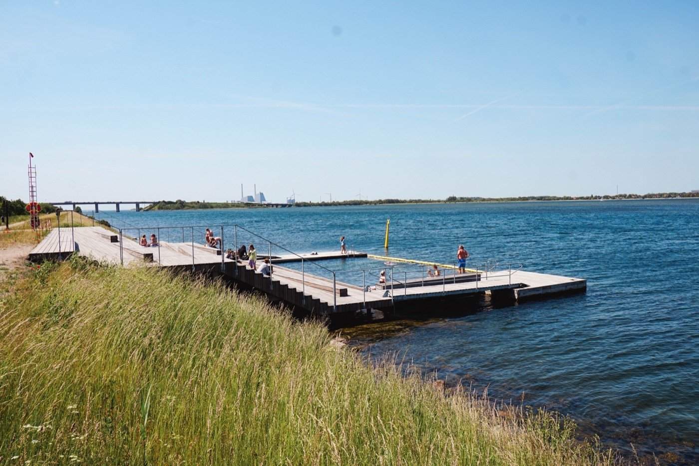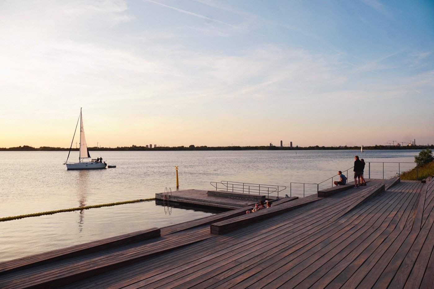 At Byskoven, the design celebrates the transition between land and water, creating a beautiful gathering place that harmonizes with its surroundings. Positioned with the city forest as a backdrop and the water at its edge, this open space is an ideal destination. A large wooden deck follows the natural contours of the landscape, creating terraces that gently merge the land with the water. This design fosters a variety of activities, accommodating bathers, kayakers, and other visitors. The expansive deck offers enough space for multiple activities to coexist.