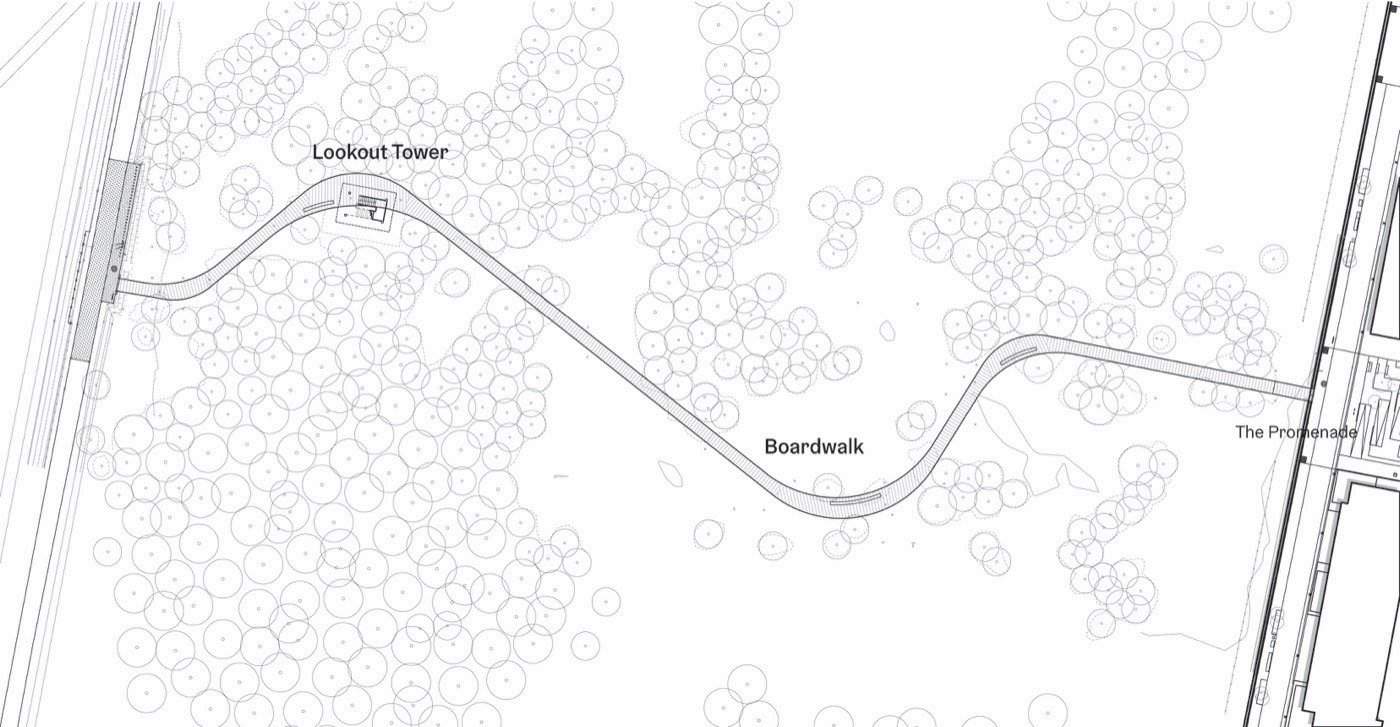 Asger Jorns Allé是公园的主要入口,创造了一个充满活力和可见的大门,欢迎游客。这个入口以一个新的观景塔为标志,它沿着城市边缘矗立着一座灯塔,从附近的地铁站可以看到。公园的入口小径蜿蜒穿过茂密的植被和沼泽地形,让游客在不干扰自然环境的情况下体验自然环境。蜿蜒的木板路提供了不同的荒野视角,导致树梢上方的视野升高。从这个有利位置,游客可以在景观中定位自己,而下面的道路则为探索开辟了新的机会。木板路与公园更广泛的步道网络无缝连接,邀请人们进一步探索阿玛格自然公园丰富的自然景观。