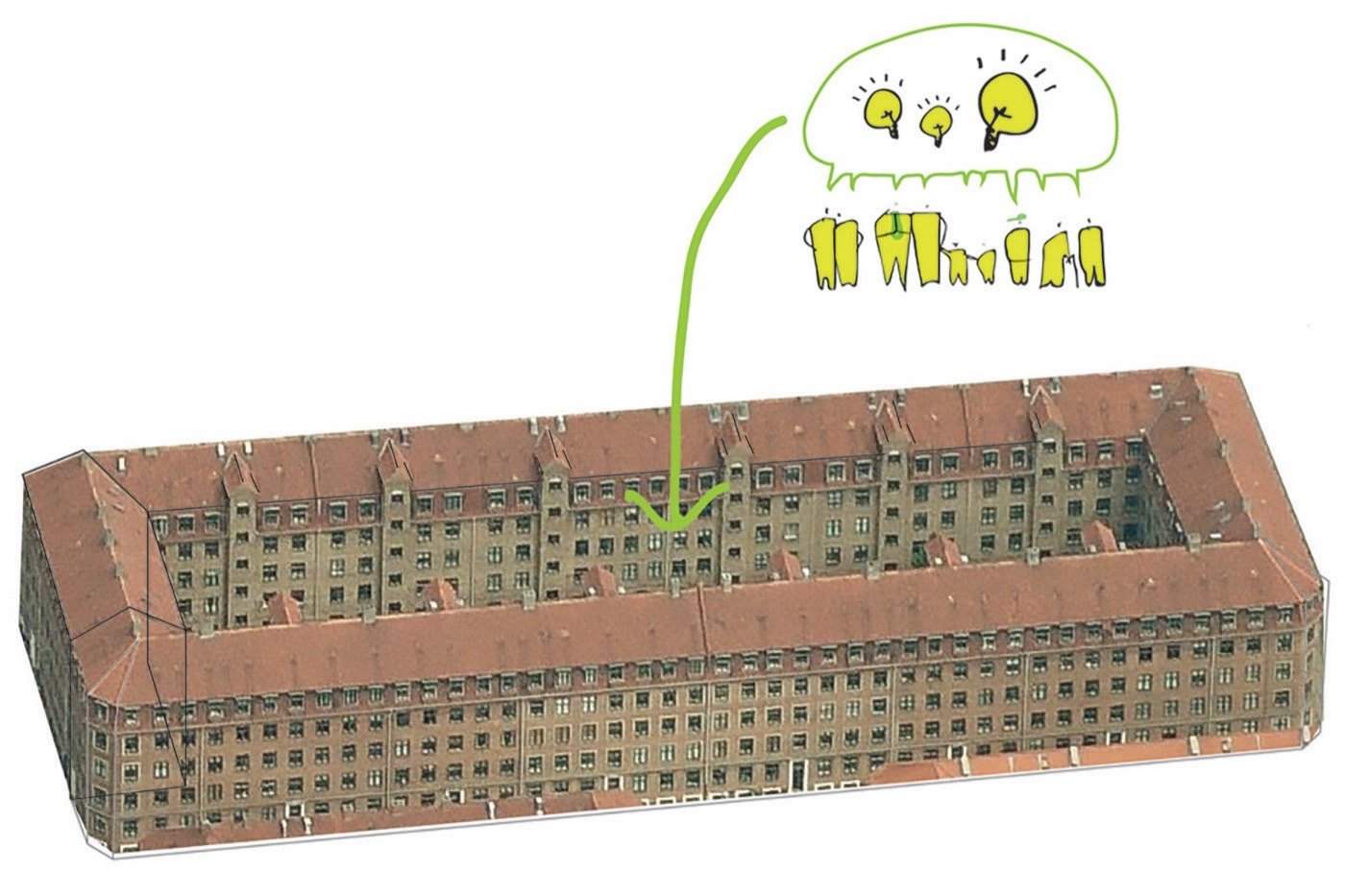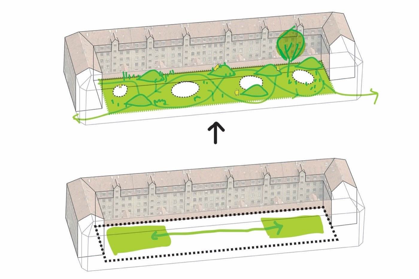 Sustainability is central to this renovation, with the choice of materials and design carefully considered to minimize environmental impact. The project aspires to create a distinctive courtyard that reflects modern principles of sustainability while also fostering vibrant and inclusive community life. This courtyard is not merely a place to live but a meeting ground where urban nature, people, and sustainability come together in a harmonious symbiosis.