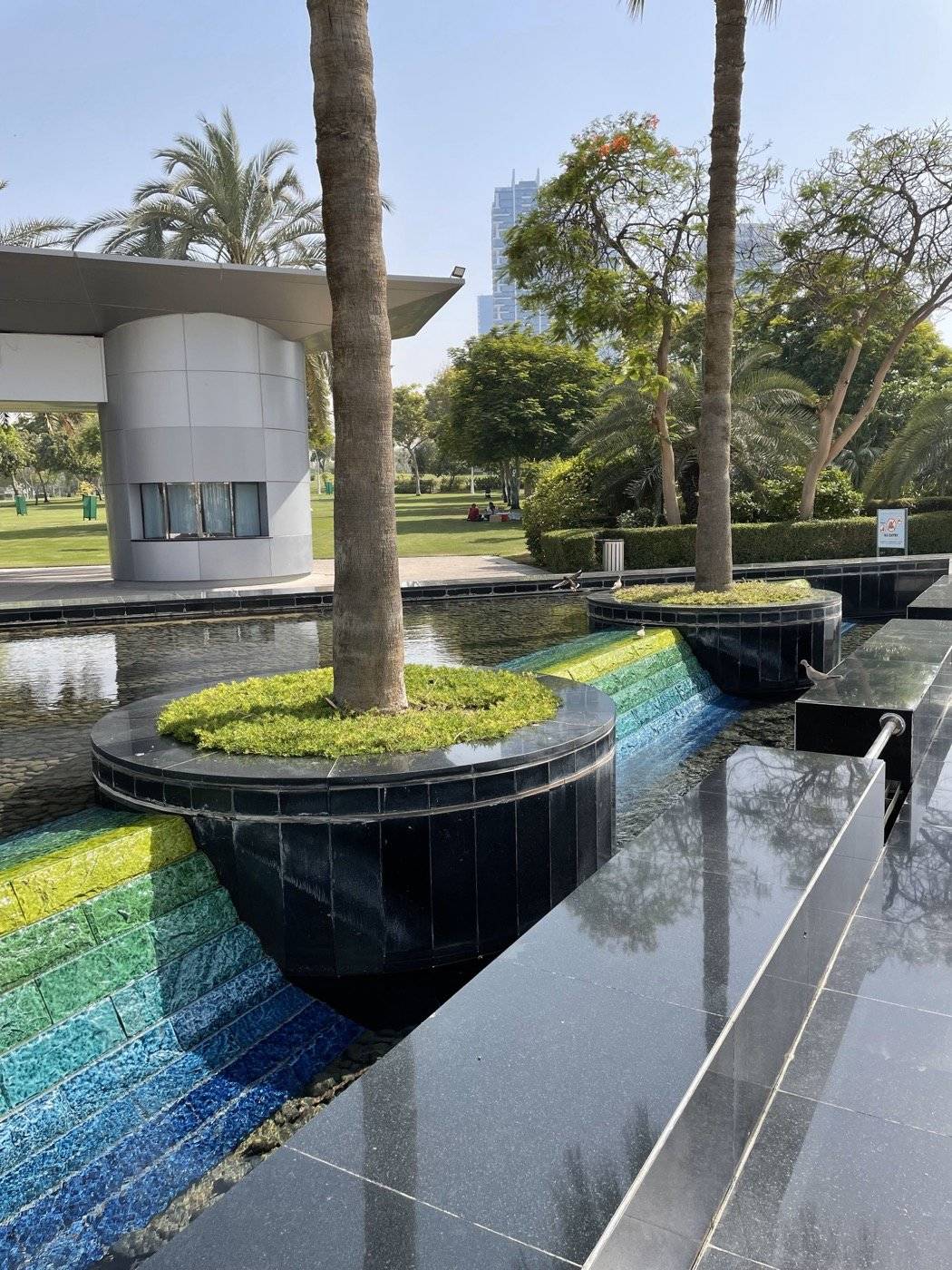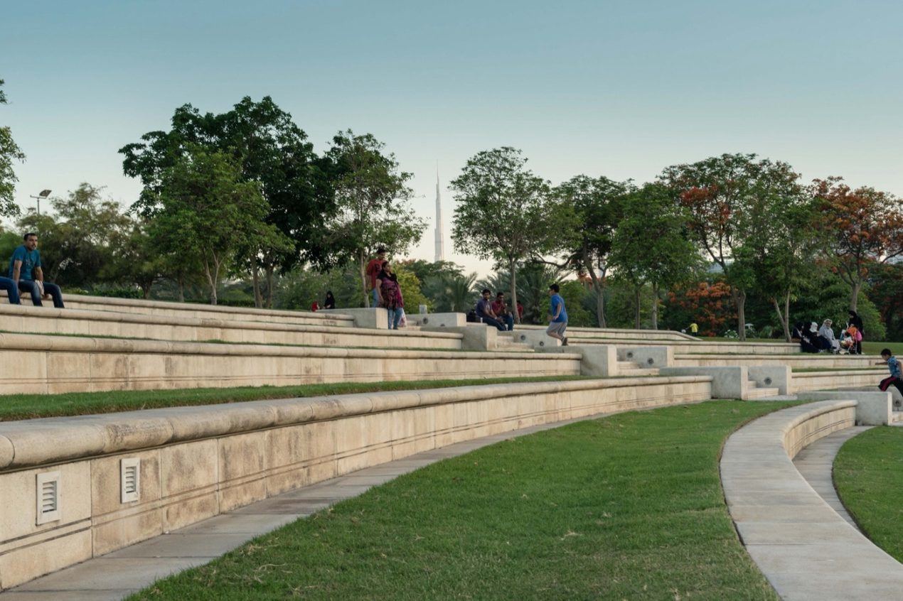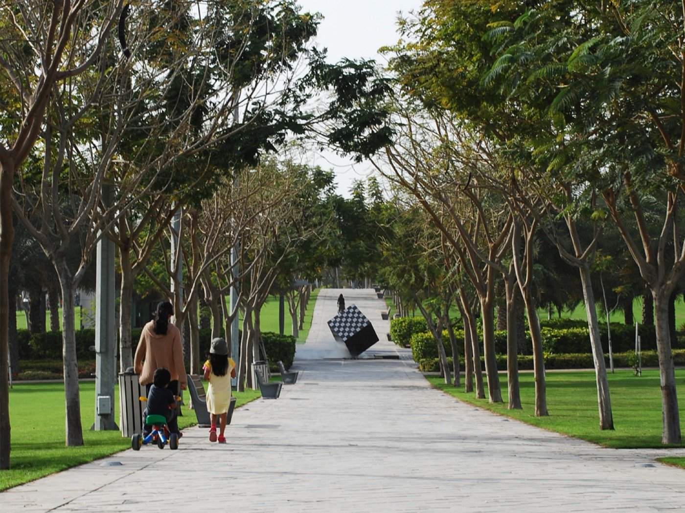 Cracknell设计了一个50多公顷的起伏如画的景观,灵感来自欧洲公园美学,但带有中东风味。由悬挂的人行天桥和小径连接的遮荫区,将划船湖和带水景的主题花园连接起来。有一个有香味的玫瑰花园,一个放松、芳香的草药园和一个举办教育展览的儿童花园。公园各处点缀着一系列著名艺术家的引人注目的雕塑,包括大卫·哈伯,带领游客走上一条有趣的蜿蜒之路。