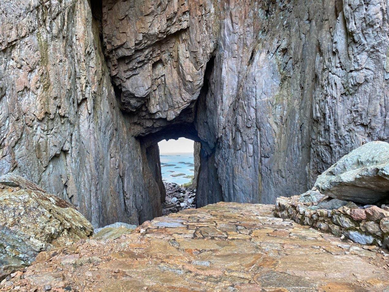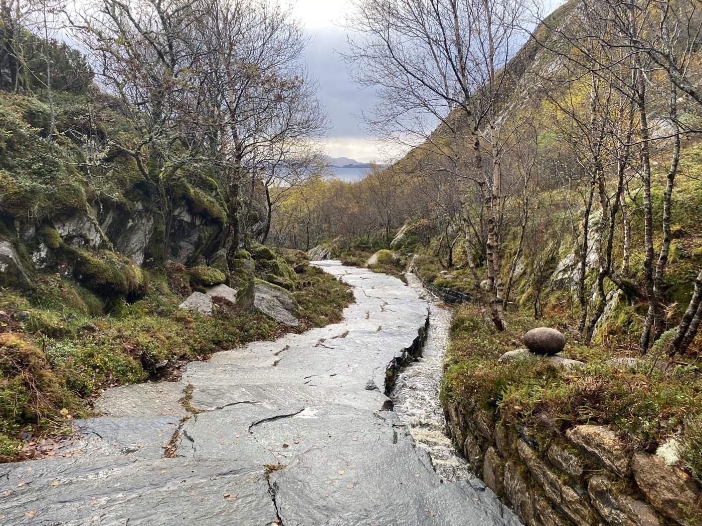 However, the path could no longer accommodate the growing number of tourists. Erosion had severely deteriorated the trail leading to the hole, making it difficult and unsafe for hikers. The absence of a continuous path around and through the hole further diminished the hiking experience. To address these issues, Østengen & Bergo designed a hiking trail to the Torghatten hole from both the east and west sides, as well as a path through the hole itself. In addition, a new universally costal path was designed to connect the entire area, allowing for a round trip. Along the trail, going through various of dramatic, steep and breathtaking scenery, several resting and recreational spots are established at locations with beautiful views or interesting geological or historical features. Information signs are placed along the path and tell a little about the many natural and cultural qualities you will find on the trip. The stormwater that was previously one of the biggest challenges, and which dug out the path, has now been brought forward to the delight of visitors. Water is now directed away from the path and down into beautiful, open natural stone drains and on to streams that have been opened, providing a positive, calming and sound-creating element along the circuit. The open drains are made of local Norwegian natural stone and add an aesthetic value to the area even when they are dry.