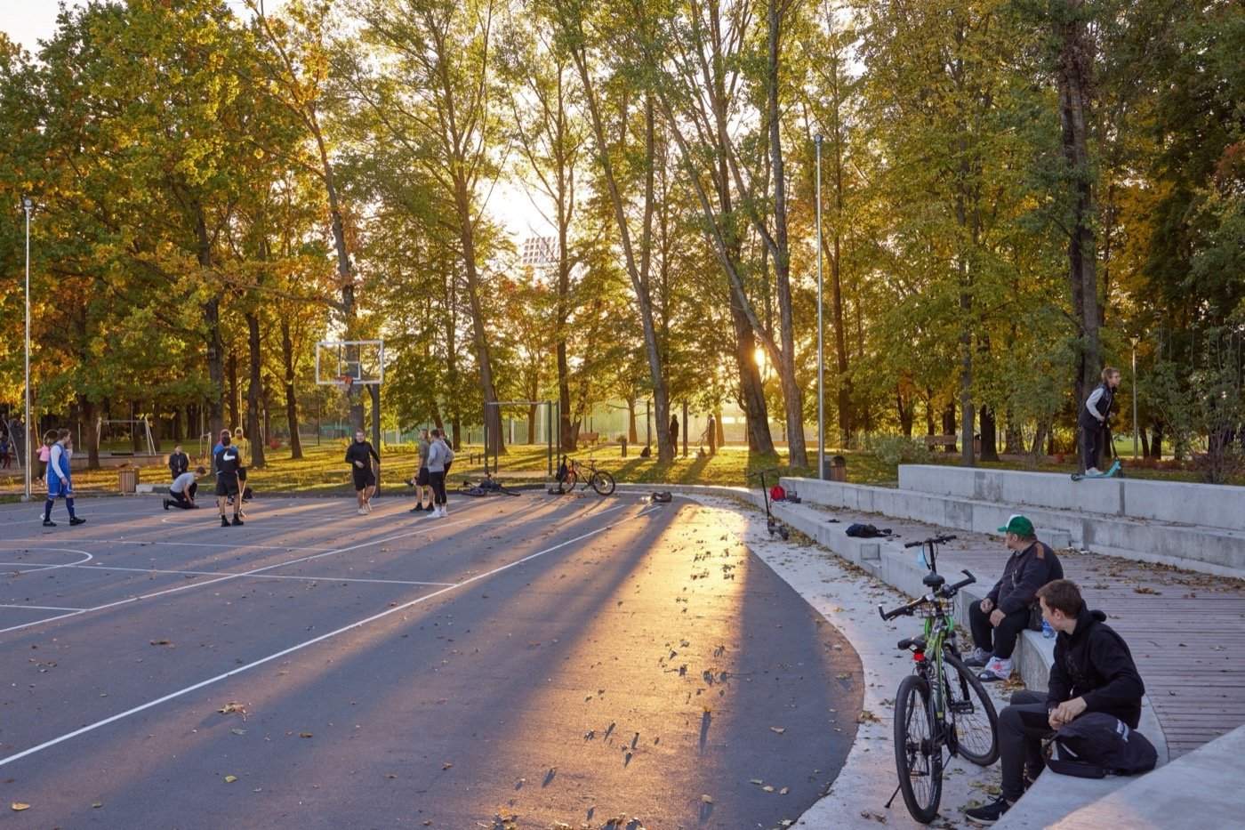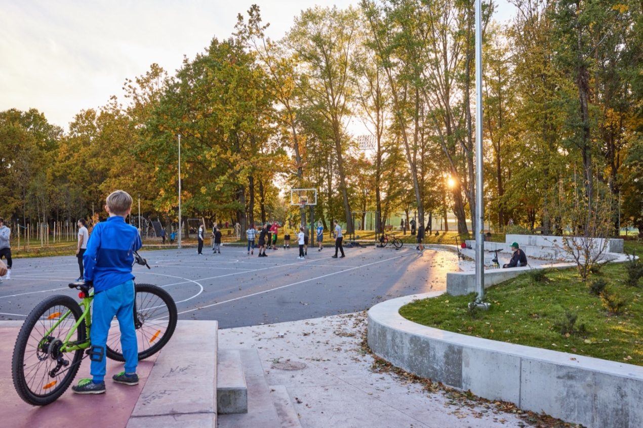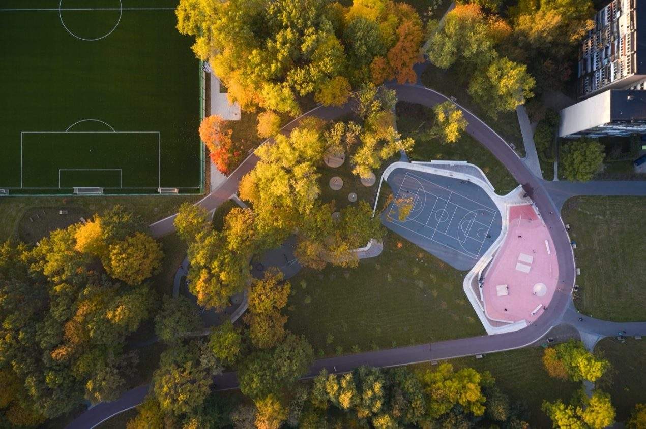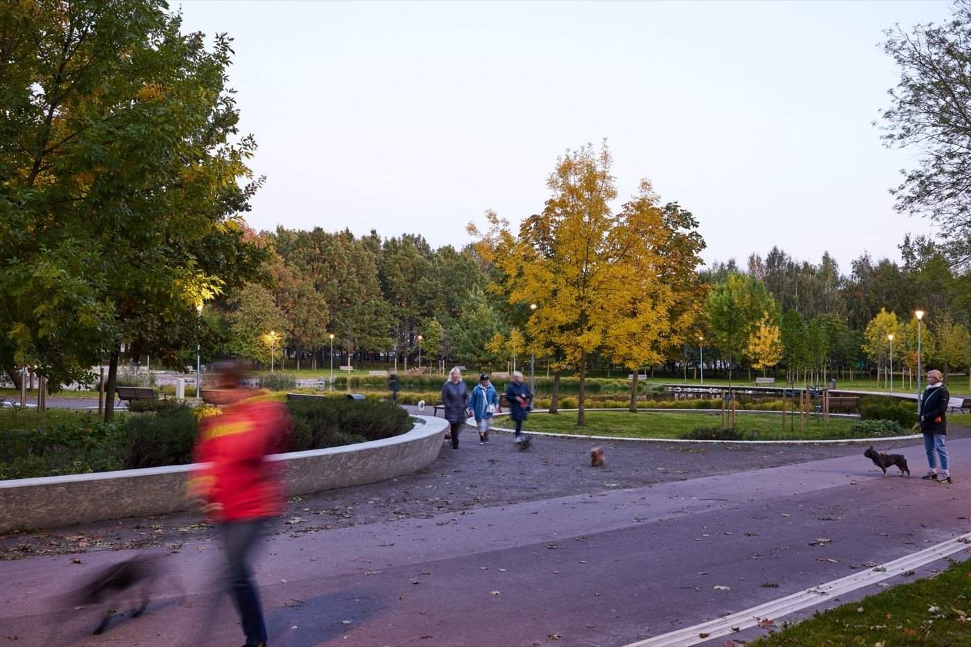 The design of Oak Grove Park responds to the varied needs of its residents. On one side of the park is a lively, active area with sports fields, fitness zones, and playgrounds for children and teenagers. The other side offers a more tranquil atmosphere, featuring ponds with local birdlife, sunlit or shaded islands with benches, and flower beds. A continuous loop path for cycling and walking links smaller pathways and recreational spots, winding between the old oak trees and nearby apartment buildings. This loop has become a favorite spot for residents, not only as a place to exercise but also to socialize, people-watch, and meet their neighbors.