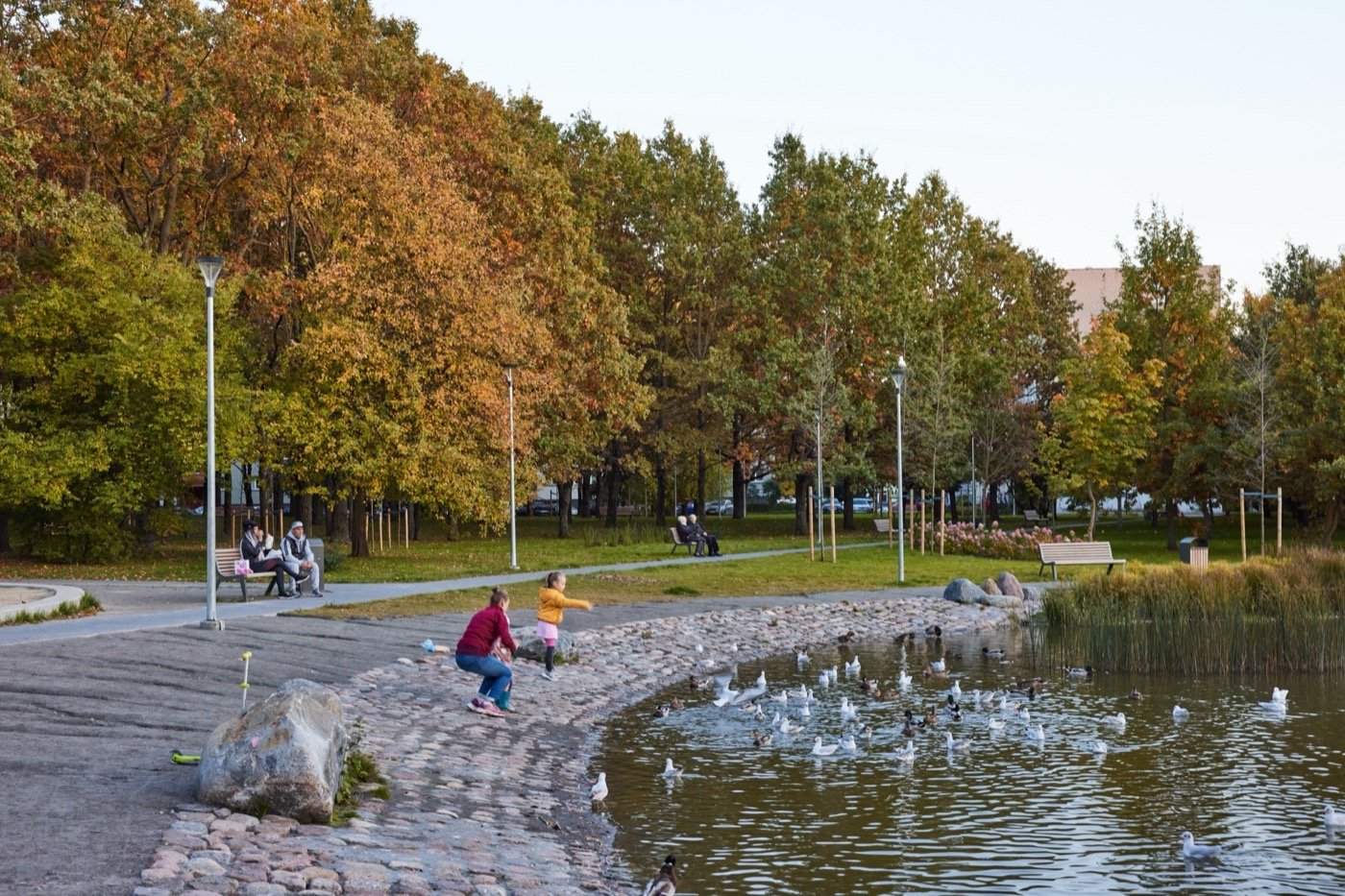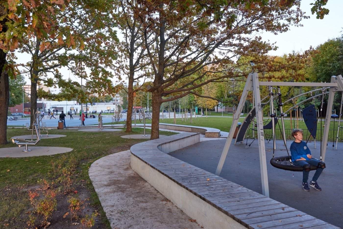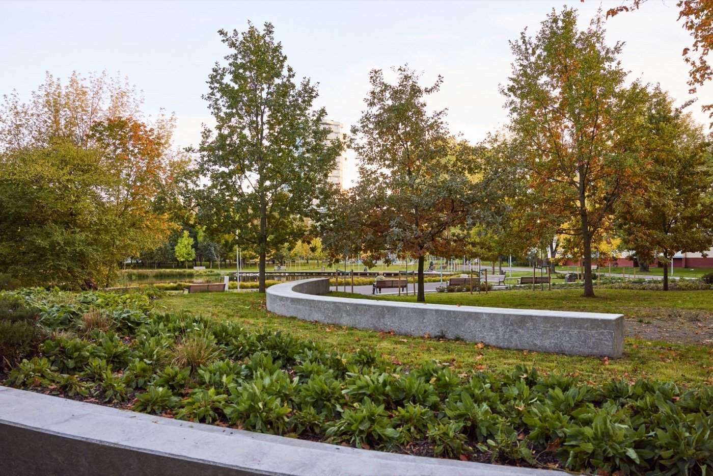 The design of Oak Grove Park responds to the varied needs of its residents. On one side of the park is a lively, active area with sports fields, fitness zones, and playgrounds for children and teenagers. The other side offers a more tranquil atmosphere, featuring ponds with local birdlife, sunlit or shaded islands with benches, and flower beds. A continuous loop path for cycling and walking links smaller pathways and recreational spots, winding between the old oak trees and nearby apartment buildings. This loop has become a favorite spot for residents, not only as a place to exercise but also to socialize, people-watch, and meet their neighbors.