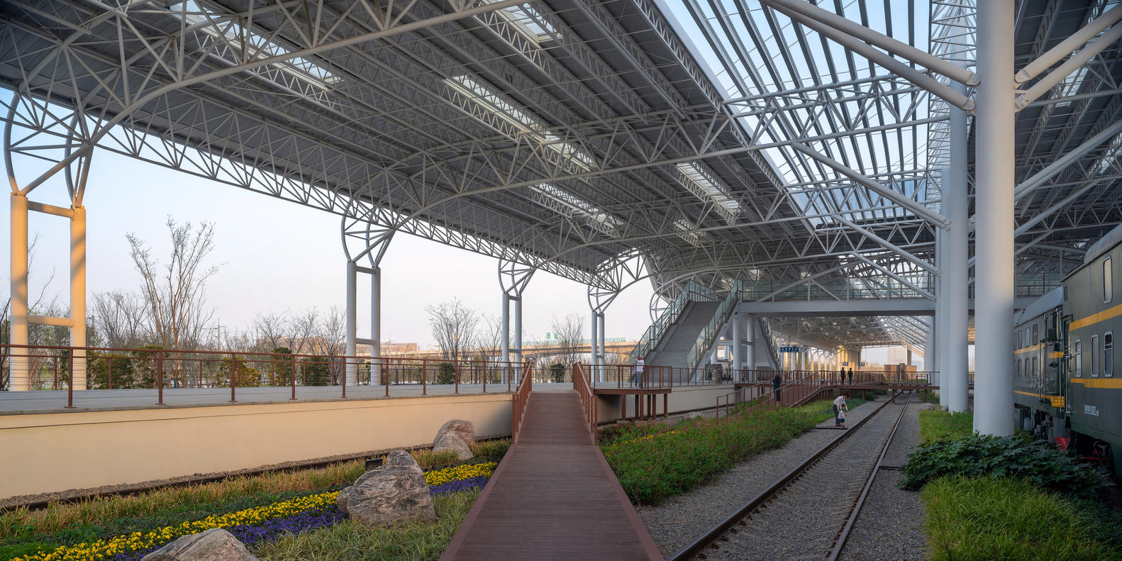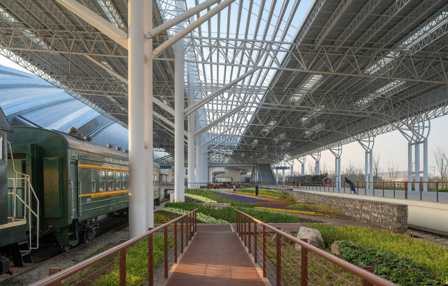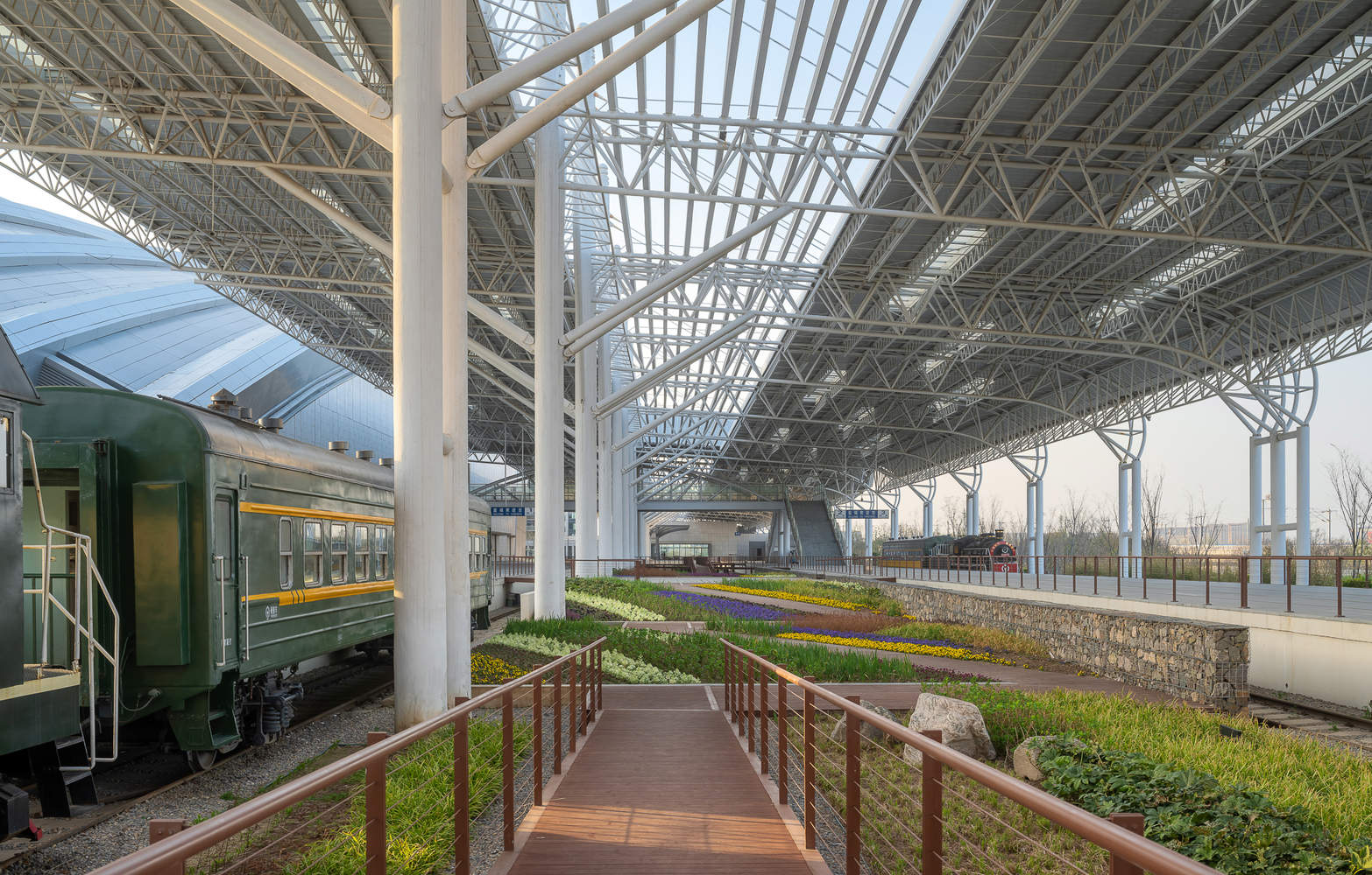 “微整形”策略下的场所精神延续:面对承载城市记忆的铁路元素,设计采取了“微改造,轻介入”的克制策略,最大程度地保留了站台的钢结构、雨棚、铁轨和枕木。通过对雨棚进行局部结构优化(如增设天窗引入天光)和立面维护,突显了桁架的结构美学。同时,通过植入斜向栈道,将原本“可远观”的铁道区域转变为“可近游”的铁道公园,并利用就地取材的铁路砾石制作石笼墙景观,实现了对场所精神的尊重和文化记忆的有效延续。