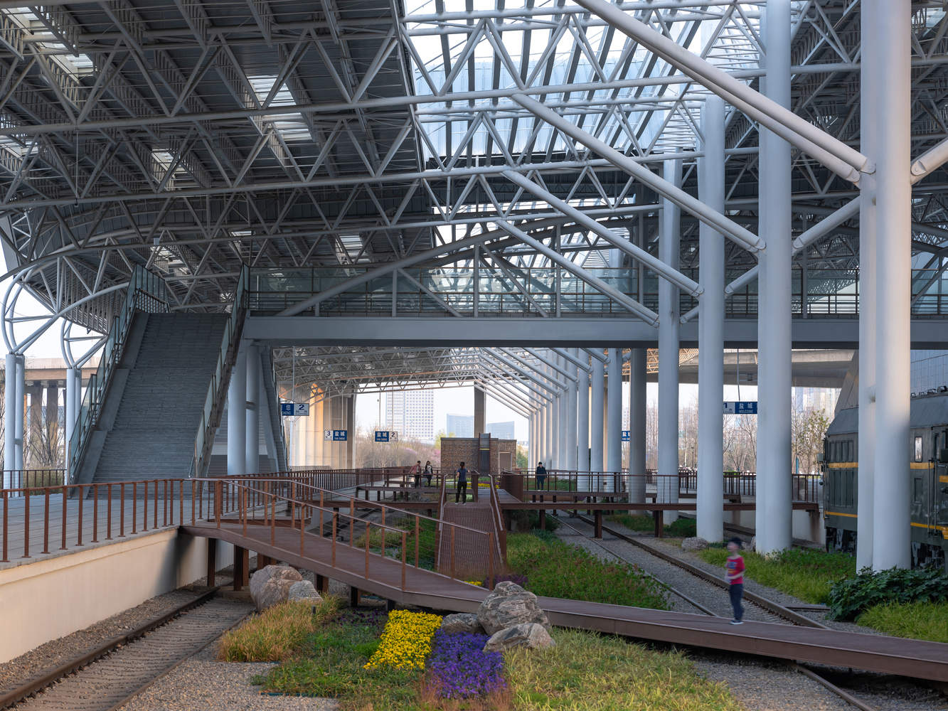 The landscape design followed the existing contours. Only the ground paving in the original platform area was replaced; the rails and sleepers were kept as they were. At the same time, diagonal walkways were implanted to closely link the two sides of the platform with the railway area. The railway area, previously only "viewable from afar," became a "Railway Park for close exploration." Two old trains were incorporated into the park, allowing citizens to enter the green-skinned vintage train interiors to check in, have coffee, and experience railway culture up close.
