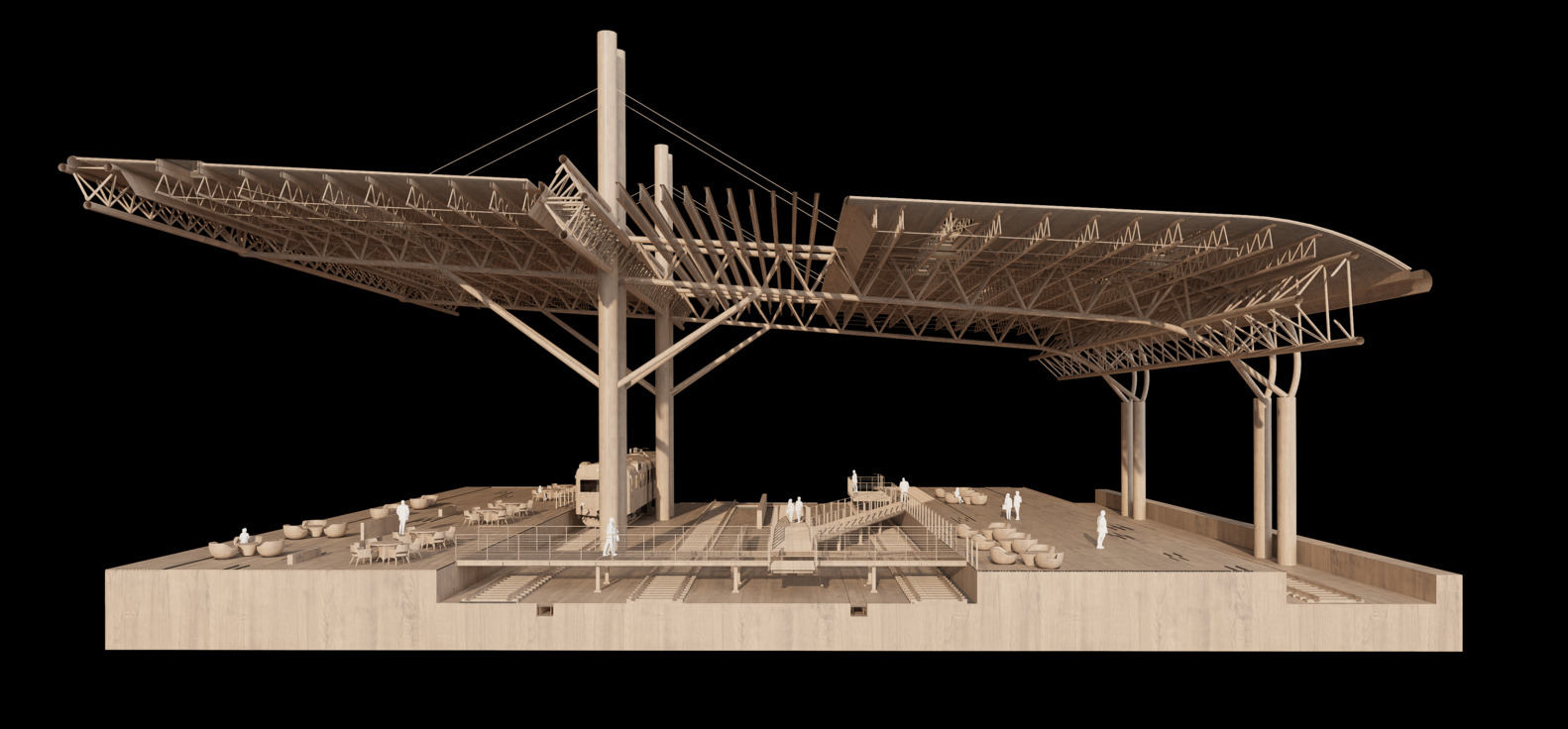 初次踏勘,现场的荒芜感是给建筑师的最深印象。刚停止使用的站台,钢柱、桁架雨棚、铁轨等元素没有受到太多破坏,似乎在述说着不甘于退出历史舞台的愿望。作为火车站区域整体复兴计划的一部分,周边分布湿地博物馆、湿地公园、五星级酒店、国际会议中心等业态。铁道公园作为连接器,将各个功能块紧密联系,形成一条步行景观轴线。