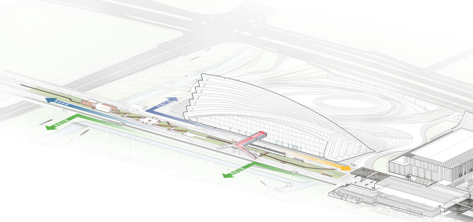 Axonometric analysis of the Railway Park connecting surrounding buildings