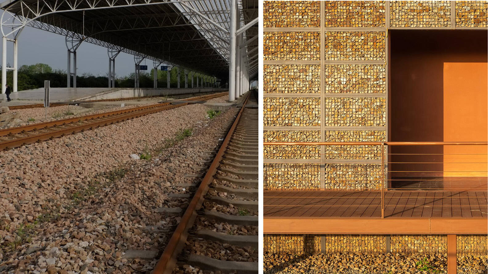 局部景观化后,部分原铁路的砾石如何使用?本案给出了一个创新的思路:做成景观片墙和建筑。栈道构件采用深色耐候钢板,与原有铁轨枕木融为一体。设计就地取材,收集铁道砾石,将其作为石笼墙使用,尽可能保留自然粗犷的场所记忆。在铁轨区新增一小品建筑,包含卫生间,机房等功能。两个体量错落布置,通过栈道与两侧站台及铁道景观区相联系。外墙采用石笼墙面,由现场铁道砾石收集而成,希望形成如自然生长出来的建筑效果。