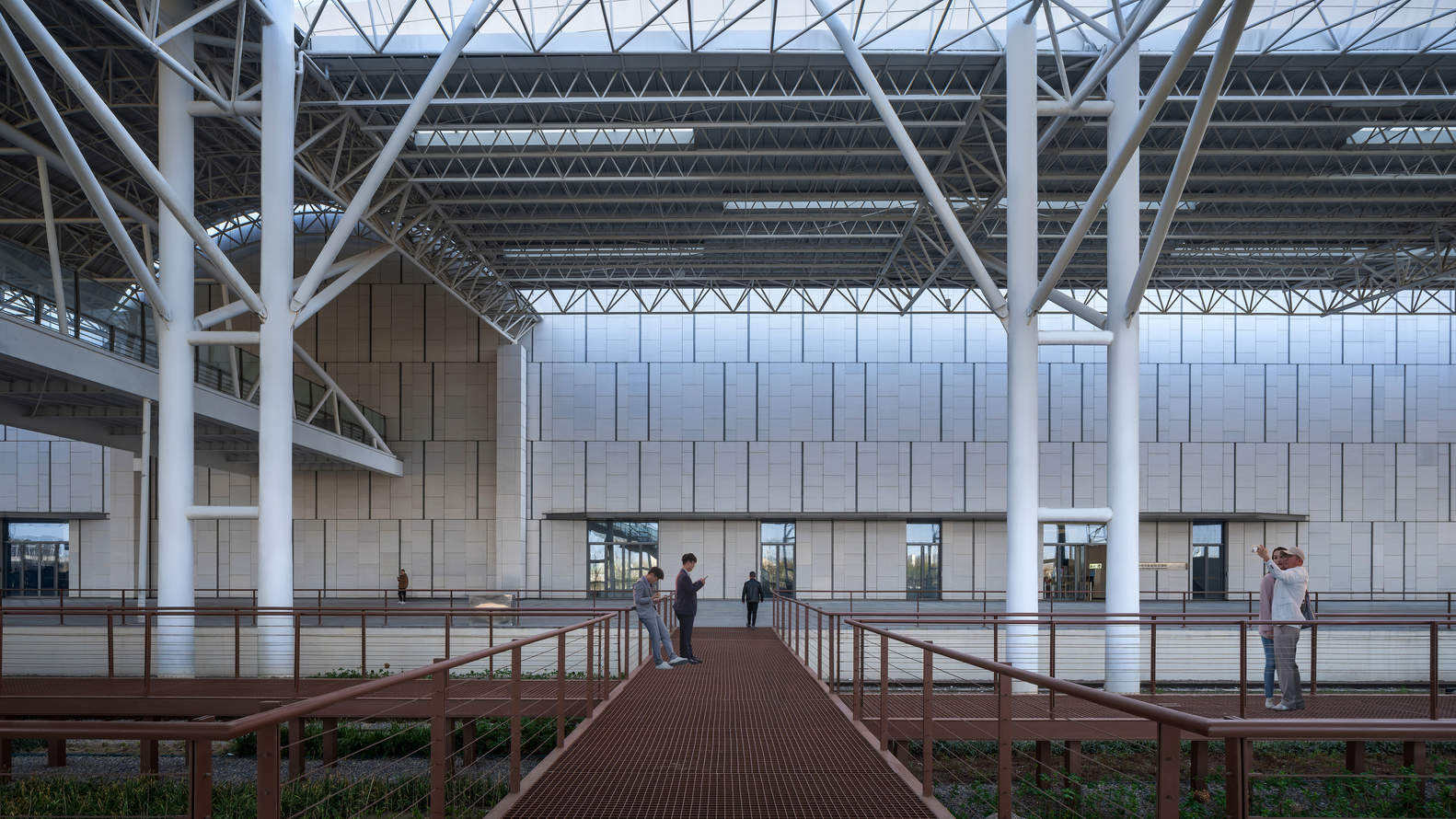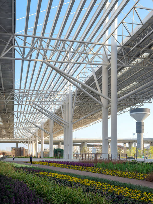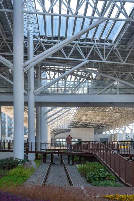 The platform canopy is the main structure on site. The renovation preserved the overall components, only applying surface repainting to ensure fire and corrosion resistance. Skylights were added to the roof, which not only increased ground illumination for plant growth but also used the daylight to highlight the structural features of the trusses.