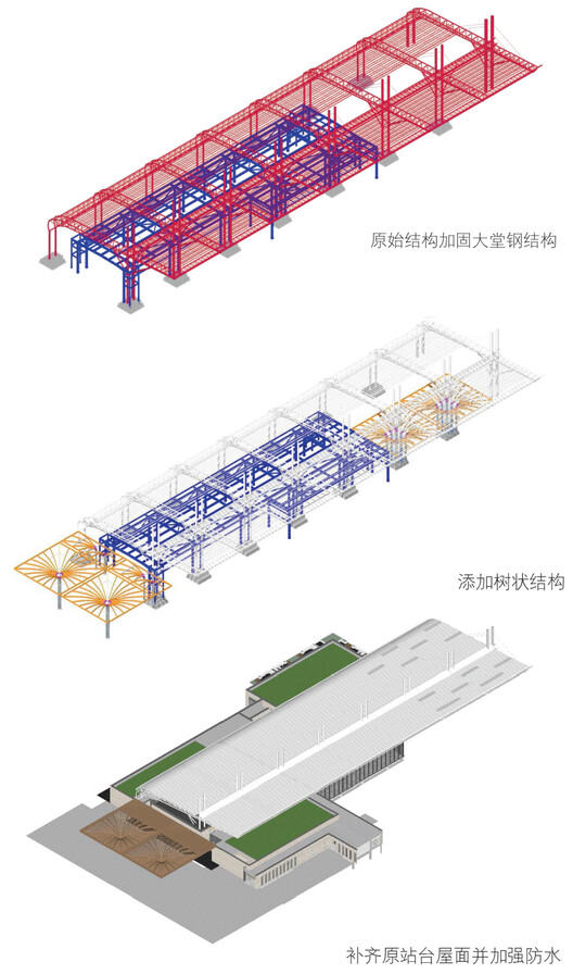 站台雨棚是基地上最主要的构筑物,改造保留整体构件,仅进行表面喷漆处理,确保防火防腐性能。屋面上增开天窗,在增加地面照度保证植物的生长的情况下,通过天光渲染,凸显桁架的构造特征。