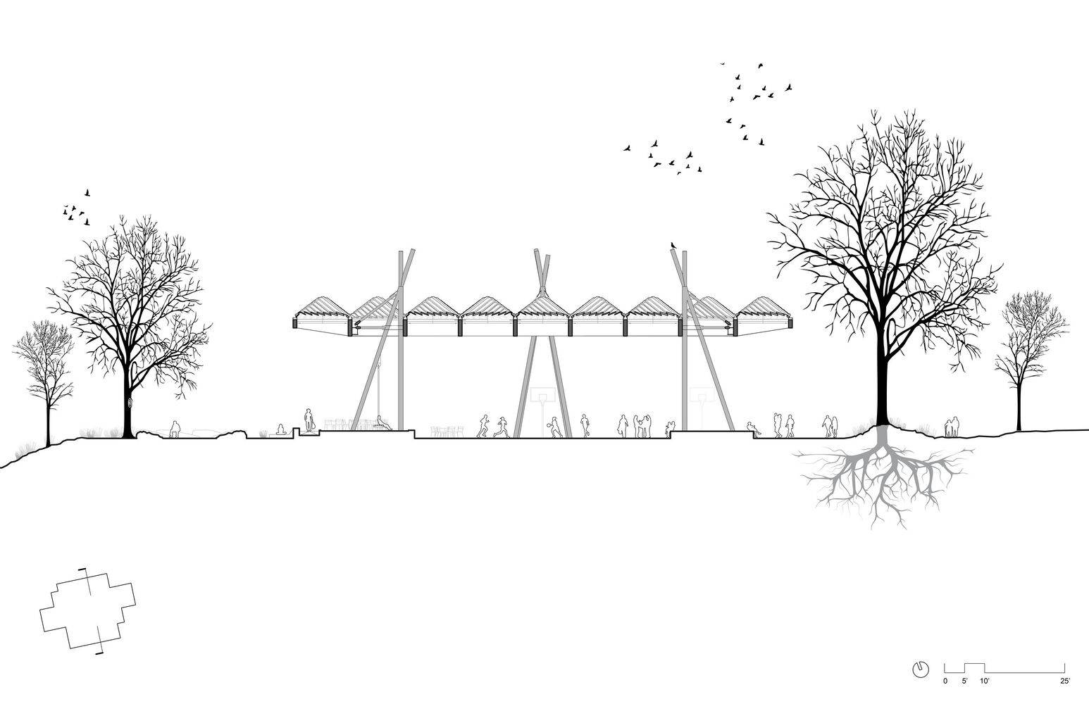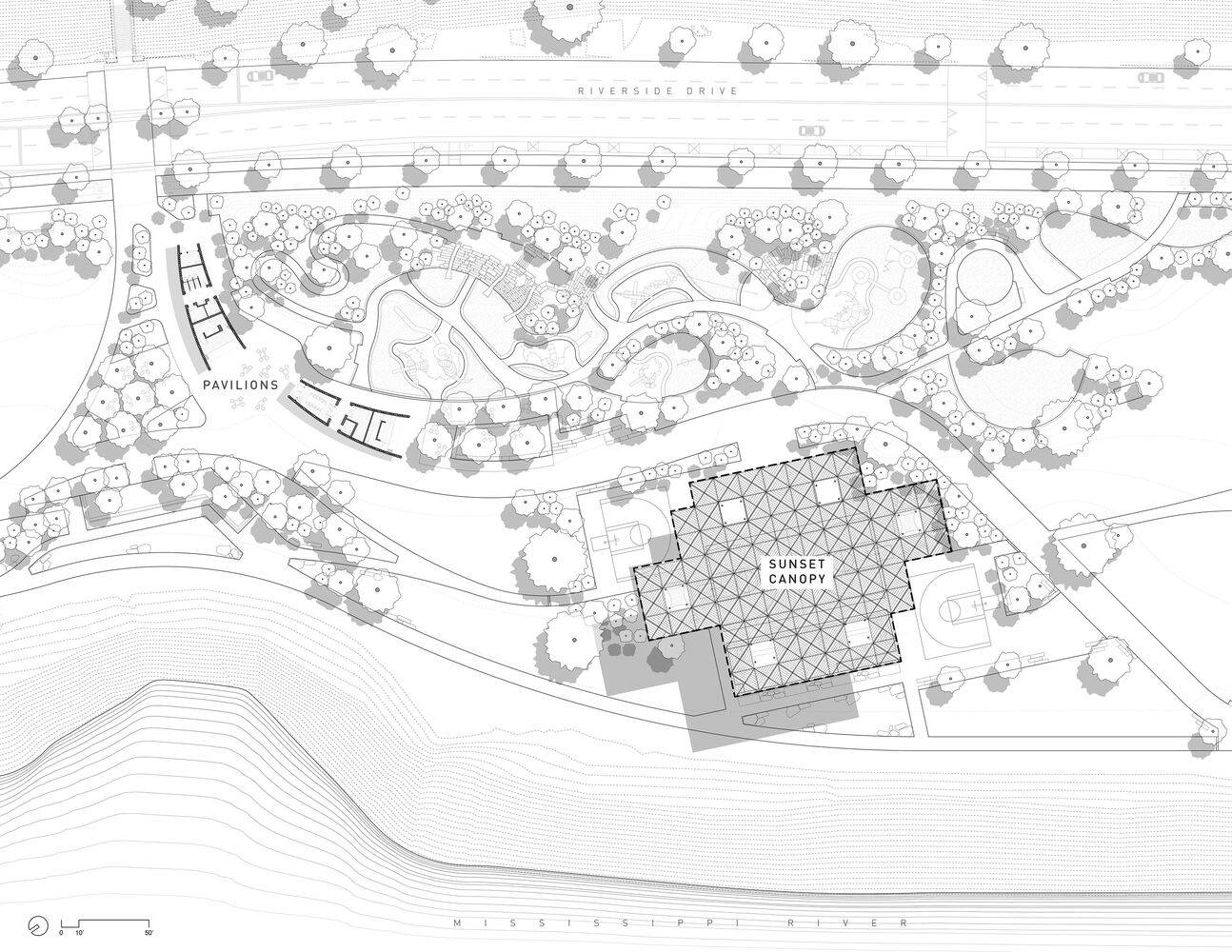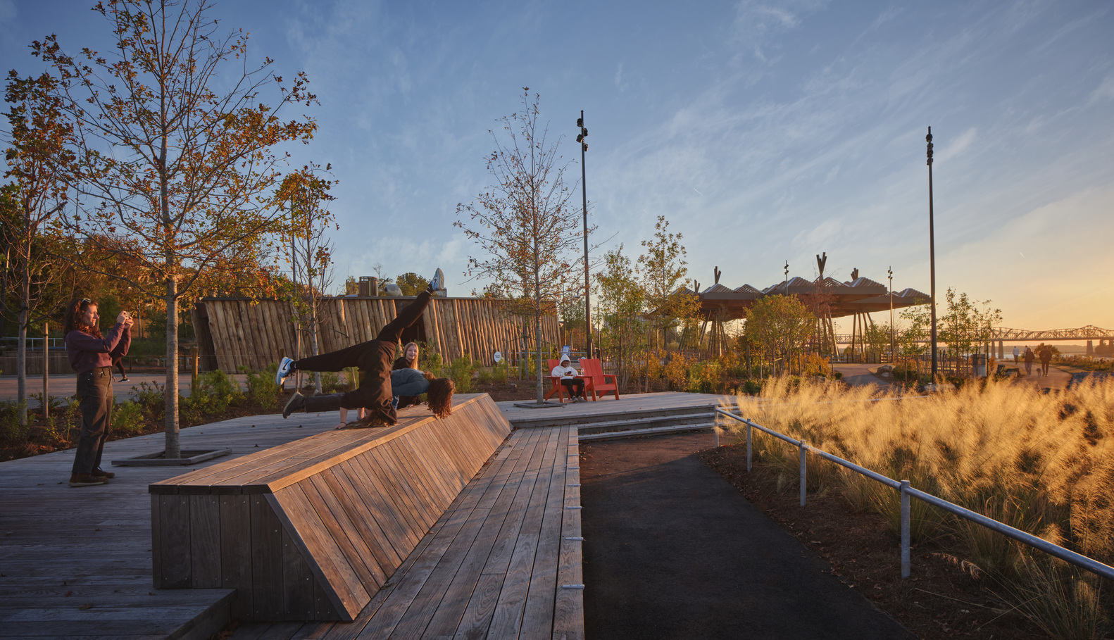 公园由一系列开阔草坪划分出四大区域:市民门户区(Civic Gateway)、活力核心区(Active Core)、社区滩涂区(Community Batture)和生态台地区(Habitat Terraces)。尽管各区域特色鲜明,但均遵循以密西西比河水文形态为灵感的总体规划。这里曾是一片平坦的草坪,如今已转变为起伏的本土植物与树木丘陵,塑造出受密西西比河动态之美启发的空间。