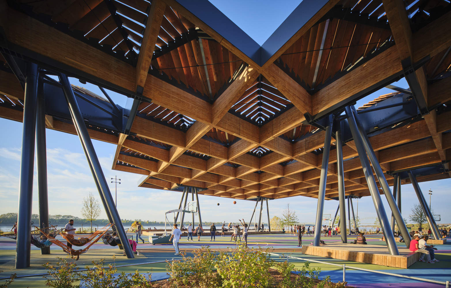公园的建筑核心是日落华盖(Sunset Canopy),这是一座占地 16000 平方英尺的木质结构建筑,由六根“集束式”钢柱支撑。其木梁采用胶合木(层积材,glulam)建造,这种工程木制品的碳足迹远低于传统的钢筋混凝土或钢材。木梁上方,同样由木材制成的百叶屋顶遮阳板为下方区域提供遮阳挡雨功能。该亭阁设计用于全年举办各类社区活动和赛事,包括篮球赛、瑜伽课、舞蹈课和音乐会等。