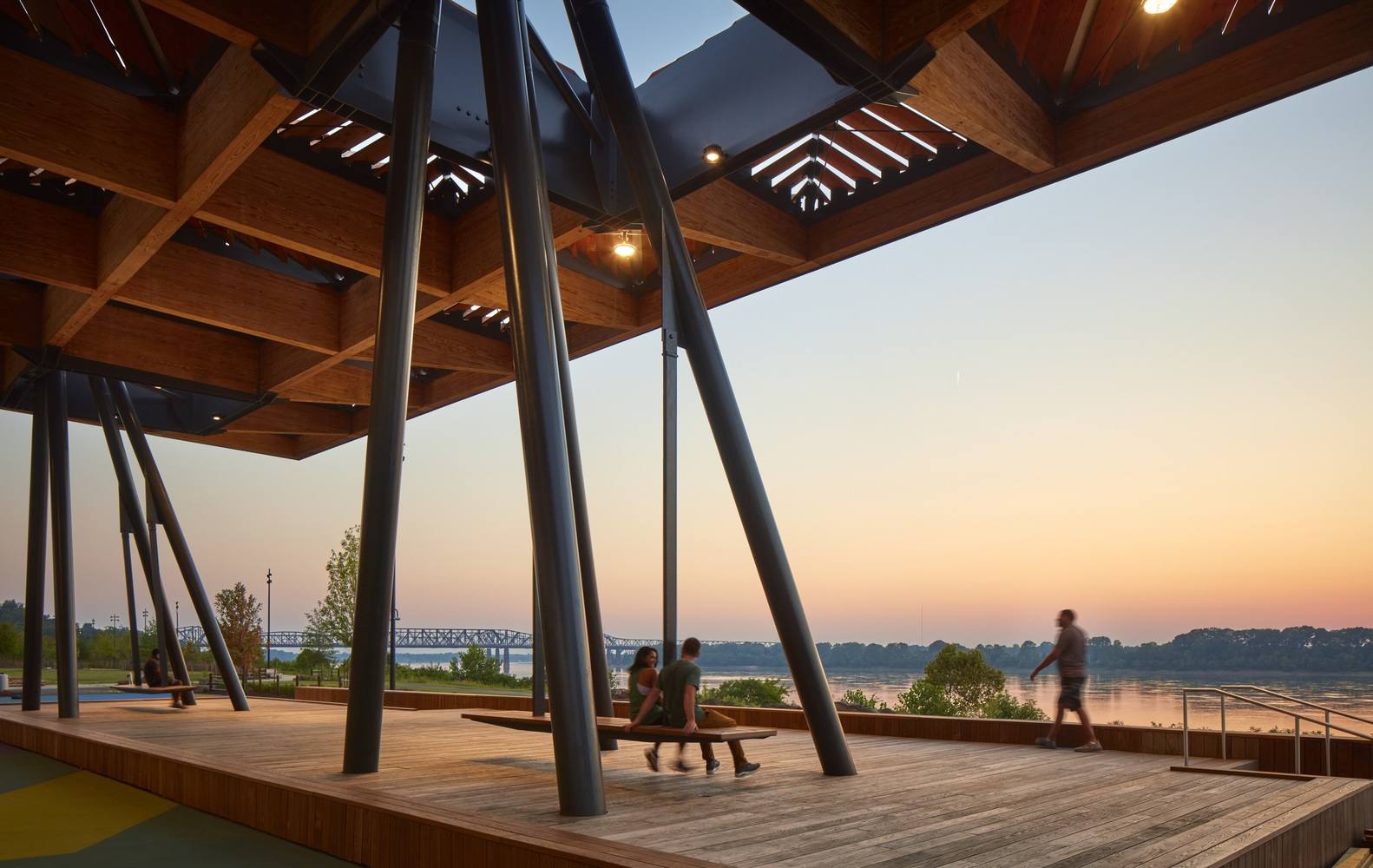 The design of Tom Lee Park also strengthens the connection between Downtown Memphis and the river. The park provides the first ADA-compliant river access for people with disabilities via the Cutbank Bluff and features safer pedestrian crossings of Riverside Drive at Vance, Huling, and Butler Streets. The park’s sheltering structures are constructed from wood, inspired by the industrial buildings that once operated on the waterfront. River-themed playgrounds and landscape elements designed by Monstrum create exciting destinations for recreation, outdoor education, dining, performance, and other activities, all enhanced by the vibrant backdrop of the Mississippi River.