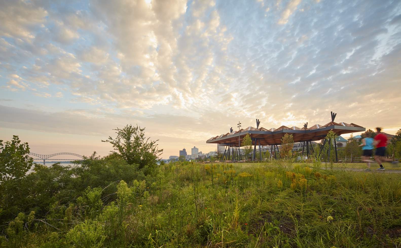 These spaces—ranging from civic engagement and active recreation to quiet contemplation—accommodate a variety of activities while also providing habitat for native birds and pollinating insects migrating along the Mississippi River flyway. The planning and design process, which began in 2017, incorporated substantive input from thousands of Memphis residents and included a Youth Design Leadership Program that deeply engaged local teenagers in the design process.