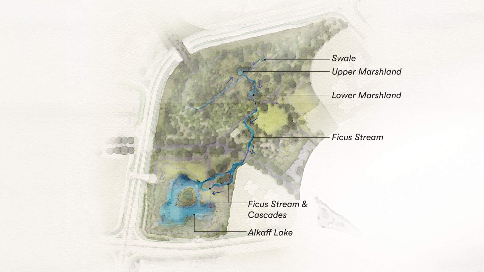 The nature-centric design places Alkaff Lake at its heart, featuring the iconic Rain Tree Island crowned by a Rain Tree (Samanea saman). This 1.8-hectare lake is the core component of an innovative, multi-functional rainwater drainage infrastructure for water management. It intercepts 90% of the site's rainwater through terraced wetlands, vegetated swales, marshes, streams, and retention ponds. During heavy storms, rainwater collects across the park into the marshes, flows through the Ficus Hil stream, and ultimately empties into the lake. After entering Alkaff Lake, the water circulates back through the terraced wetlands, forming a closed-loop system that enhances drainage capacity and bolsters ecological resilience. This water-sensitive urban design approach helps maintain natural habitats, promotes biodiversity, and attracts more wildlife.