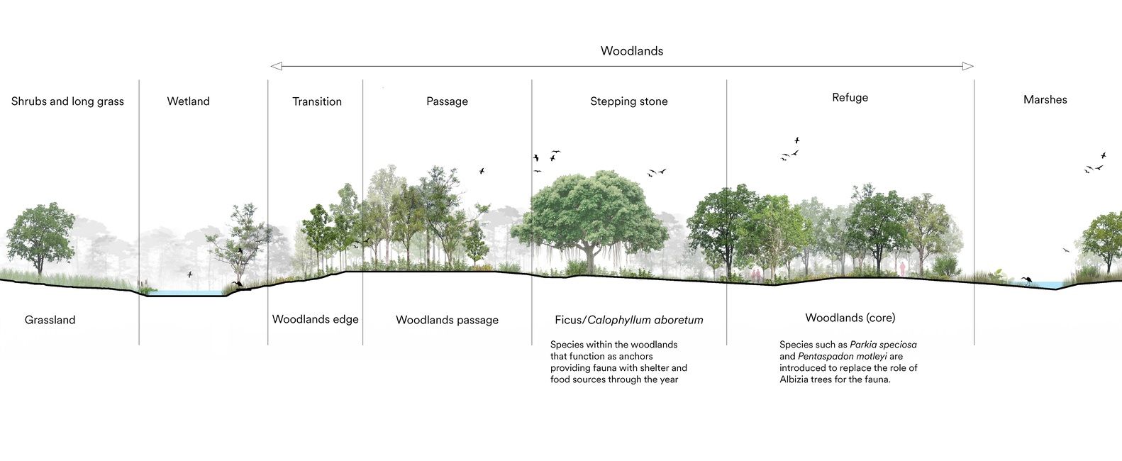 Bidadari Park is designed for all members of the family, both human and animal, featuring 6 km of walking trails, viewing decks, pavilions, and nature-inspired adventure playgrounds for children, providing spaces for rest, observation, play, and intimate engagement with local flora and fauna. Despite its urban setting, the park supports over 193 species of wildlife. It now hosts more than 50% of Singapore’s migratory terrestrial bird species and remains one of the two remaining woodland habitats in Singapore. A 100-meter-long bridge connects two mature woodland areas, allowing visitors to walk above and observe wildlife in the natural environment.