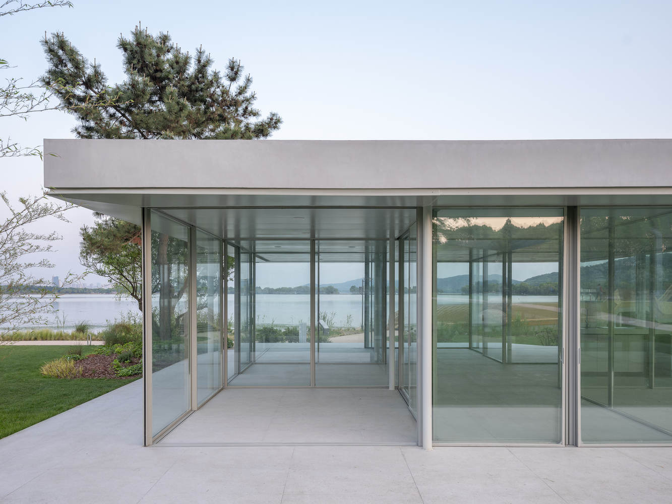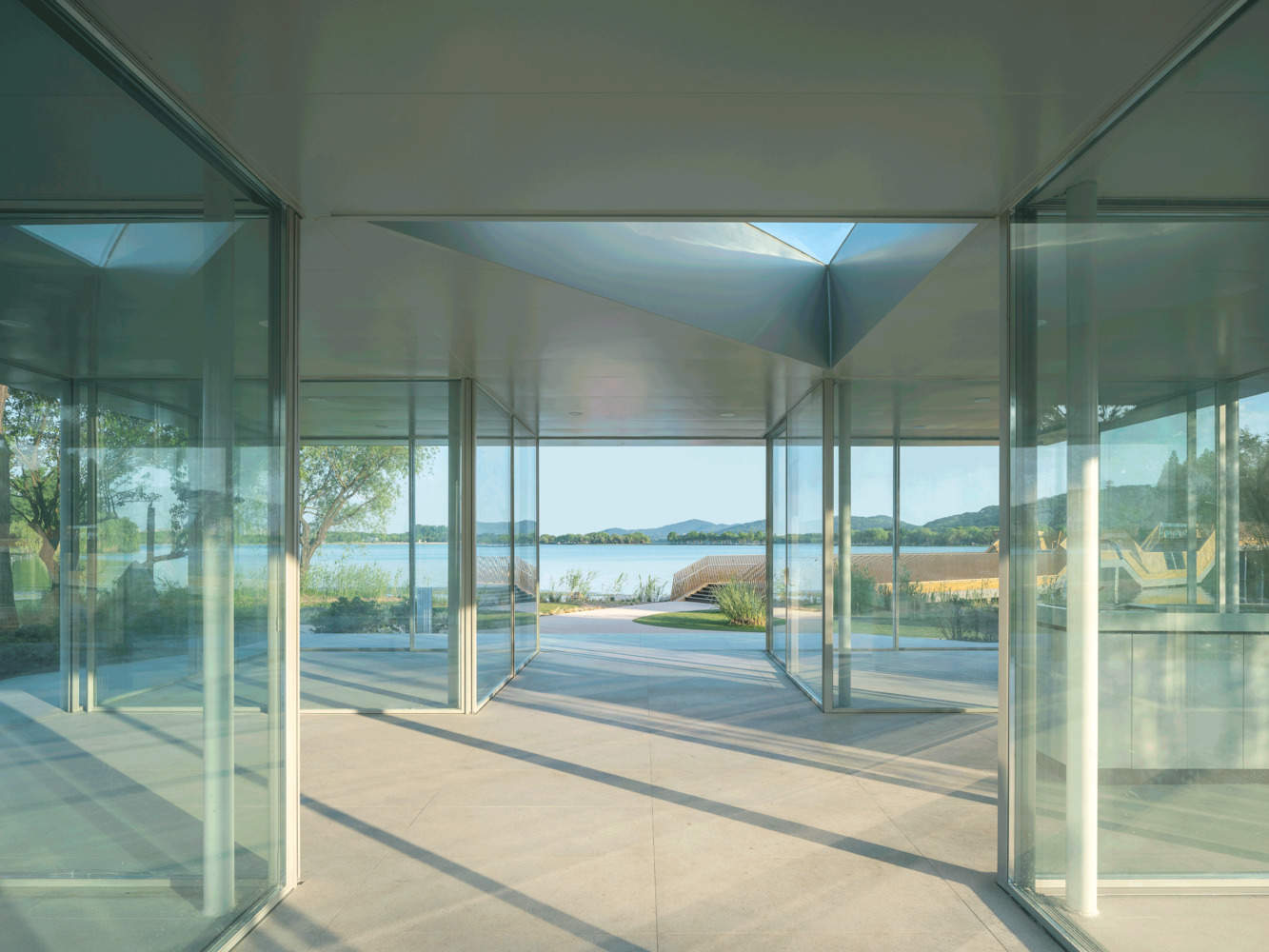 结构与动态体验的轻盈融合:项目在结构处理上体现了精妙的平衡艺术。纤细的圆形钢柱在支撑起厚重屋面的同时,保持了场地的通透感。更关键的是,灵活的玻璃滑轨门被赋予了“屏风”的功能,其开合动作直接定义了室内外的关系和景观的取景。这种动态的介入,使得使用者在移动隔断的过程中,能够切实体会到建筑的轻巧、灵动,并沉浸式地感受太湖水波与风光的环绕与叠加,实现了功能、结构与体验的和谐统一。