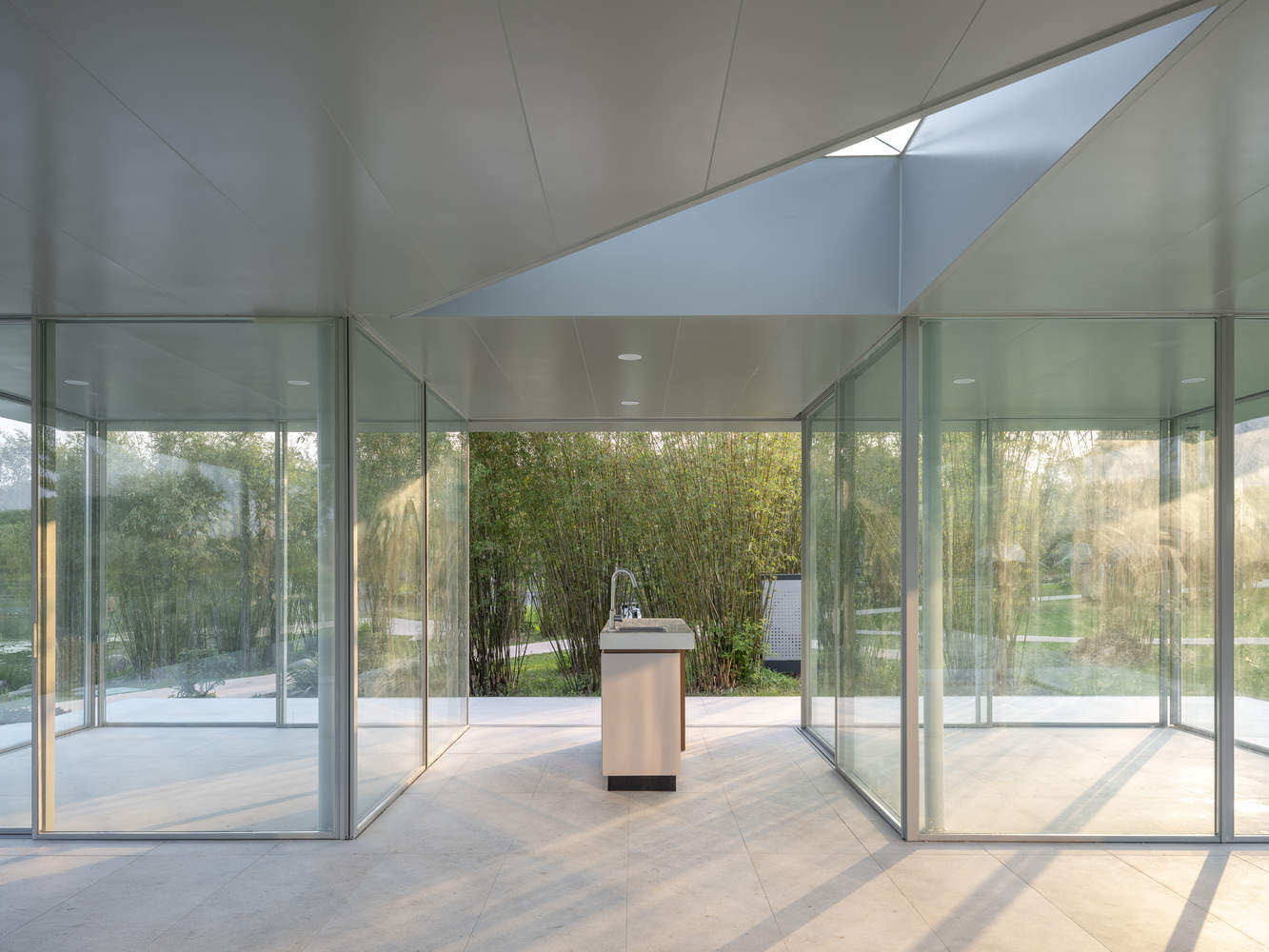 “九宫”系统的空间组织与灵活性:设计巧妙地引入了中国传统的“九宫”格局作为空间组织母题,在3.3米见方的网格系统上进行了具象化。通过12组纤细的钢柱支撑厚重屋面,并以24道玻璃滑轨门为核心构件,实现了高度可变的内部空间形态。这种基于网格和可动元素的集成,使得亭子能够根据不同的使用需求,在“十字模式”和“田字模式”等不同围合状态间自由切换,极大地增强了空间的使用弹性和场景适应性。