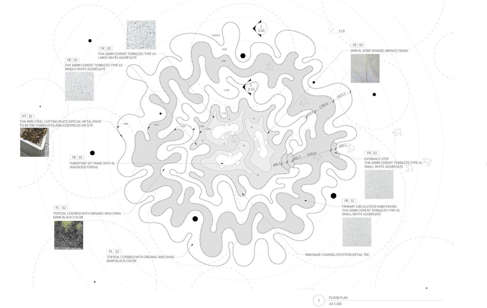 The garden is divided into three layers, each planted with different species: a tall Group A, a medium Group B, and a low Group C. Large plants arranged around the perimeter will eventually grow to human height over time. The lifecycle of the perennial herbs is respected, and as seasons change, the garden will present an even deeper and lusher appearance. The garden not only invites people to stop and appreciate but also encourages them to enter, explore, and interact with the natural world. It offers an immersive resilient experience that captures the visitors' attention and encourages them to linger.