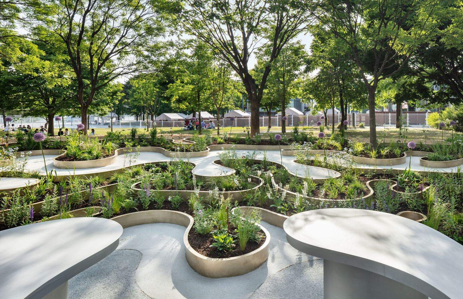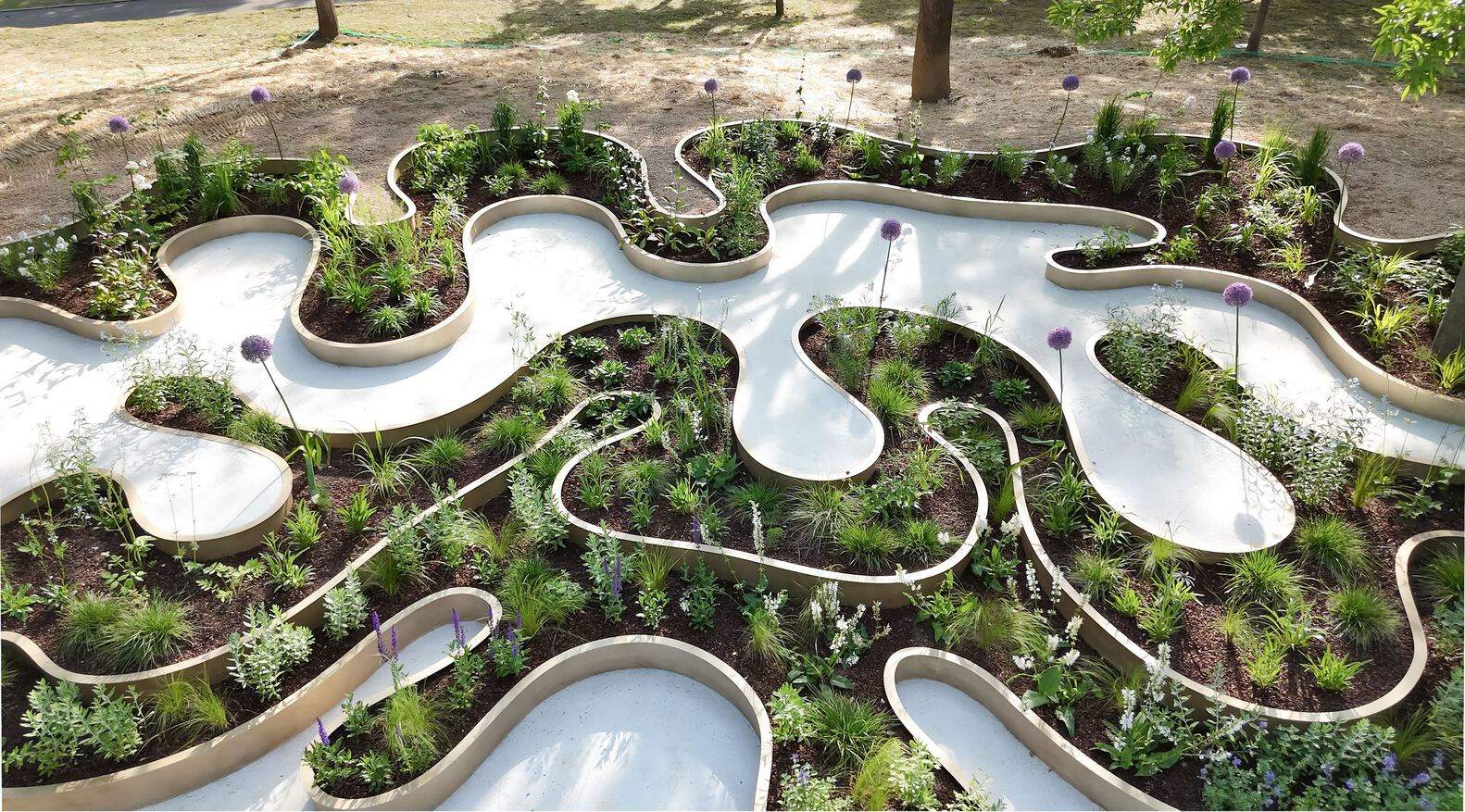 多层次的生态共生与时间维度:项目从微观的昆虫行为中汲取灵感,将其空间原理放大至人类尺度,形成了五个层次、跨越400米的连续互动结构。通过精心配置高、中、低三组不同高度的植物群落,并尊重多年生草本植物随季节变化的生命周期,设计成功地在人工结构与自然生长之间建立起动态的共生关系。这种对时间维度和植物生命力的尊重,确保了花园的景观会随着时间的推移而愈发茂盛深邃,实现了与现有环境的无缝融合,体现了对生态韧性的长远考量。