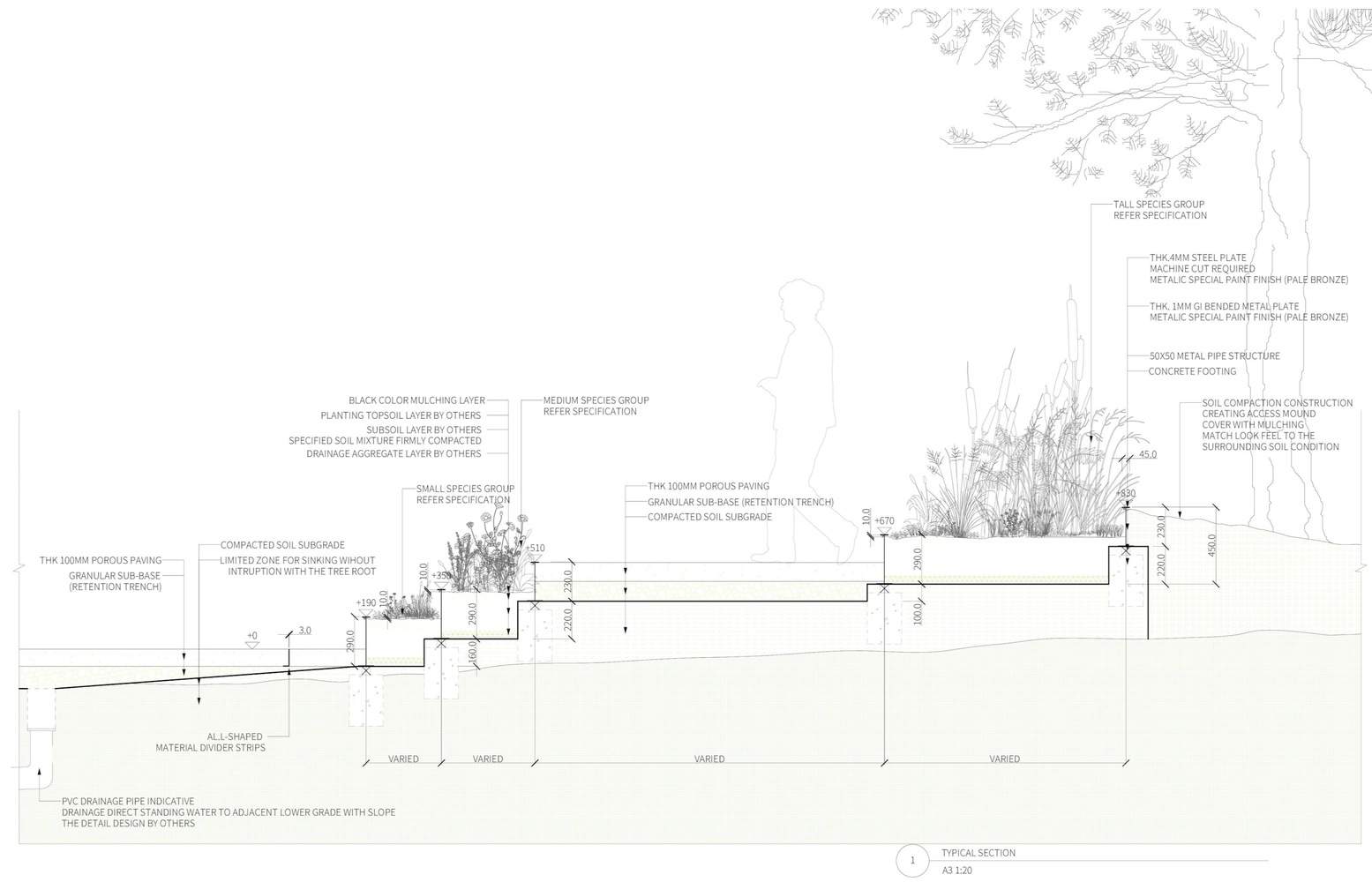 该花园分为三个层次,每个层次种植着不同种类的植物:高大的A组、中等的B组和低矮的C组。沿着花园外围排列的大型植物将随着时间的推移逐渐长到人的高度。多年生草本植物的生命周期得到了尊重,随着季节的更迭,花园将呈现出更加深邃和茂盛的外观。这座花园不仅邀请人们驻足欣赏,还鼓励人们进入其中,探索并与自然世界互动。它提供了一种令人沉浸的韧性体验,吸引了游客的注意,并让他们流连忘返。