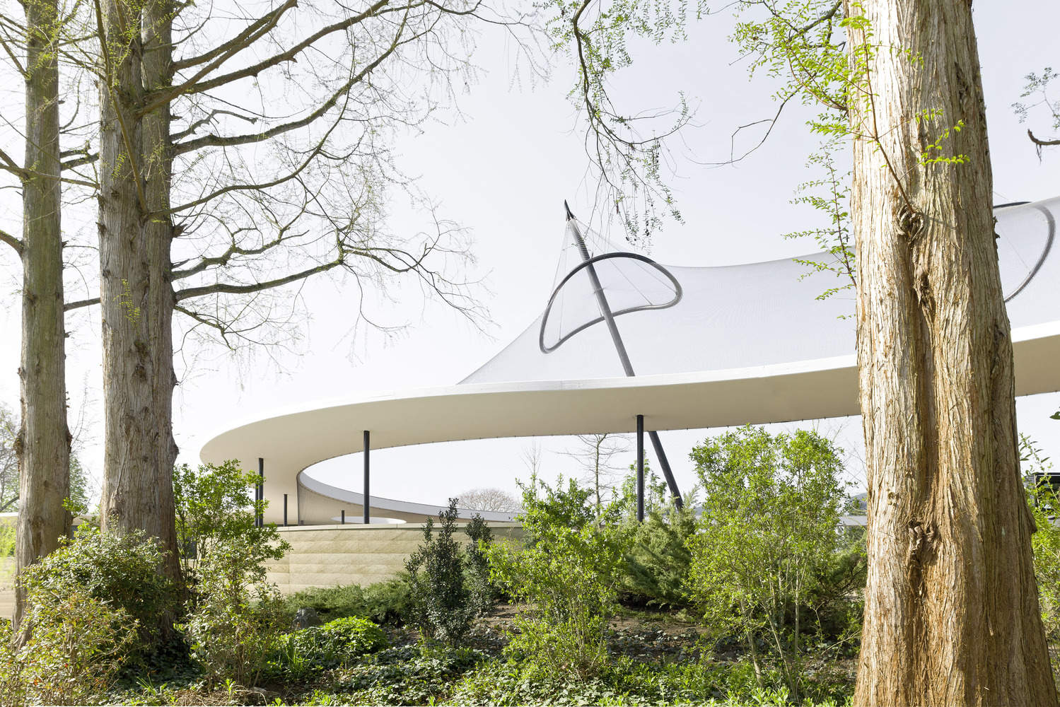 From the architect. What is special about the Luisenpark is that the landscape elements allow the building structure to recede into the background. Therefore, in the design, the new building does not appear in the traditional sense of an architectural form, but rather as a single-story pavilion with organic shapes that blend into the surrounding park environment.