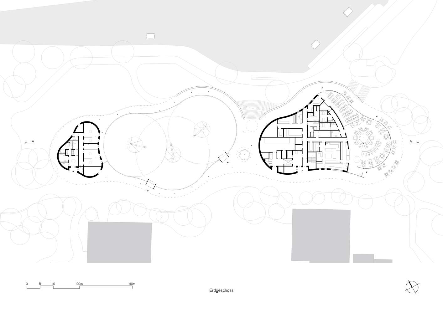 这个长约 120 米、宽达 30 米的弧形屋顶结构连接了建筑的多个功能区域。在南端,新的公园餐厅以热情邀请的姿态迎接到访的游客。用弧形玻璃幕墙围绕的就餐区可以俯瞰附近的 Kutzerweiher 池塘。在夏季,大型滑动门可以打开,让餐厅区域延伸到悬挑的遮阳篷下。