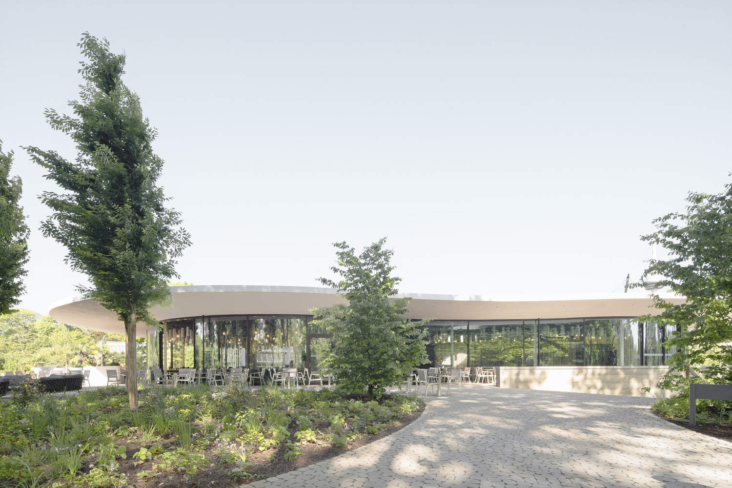 An elegantly curved roof structure rests on slender supports, covering a floor-to-ceiling glazed interior space, creating a smooth transition between inside and outside. Refined, shimmering dark green glazed ceramic elements frame the adjacent room areas. The flat profile of the slender eaves slides under the outstretched branches of the trees. The surrounding canopy provides shade and protection from the rain for park visitors.