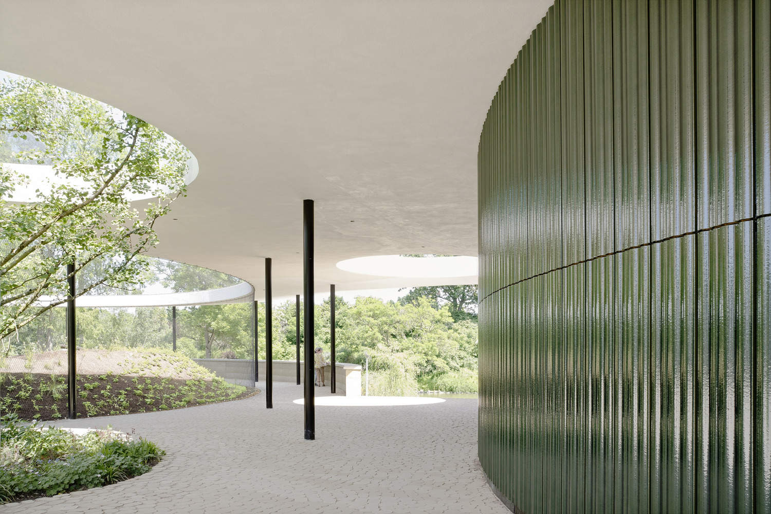 一个优雅弧形的屋顶结构搭在纤细的支撑上,覆盖着从地板到天花板的全玻璃内部空间,创造出室内外流畅的过渡。精致闪亮的深绿色釉面陶瓷元素围绕着相邻的房间区域。纤细屋檐的平坦轮廓滑入树木伸出的枝条下方。环绕四周的遮阳篷为公园游客提供遮阳避雨的保护。