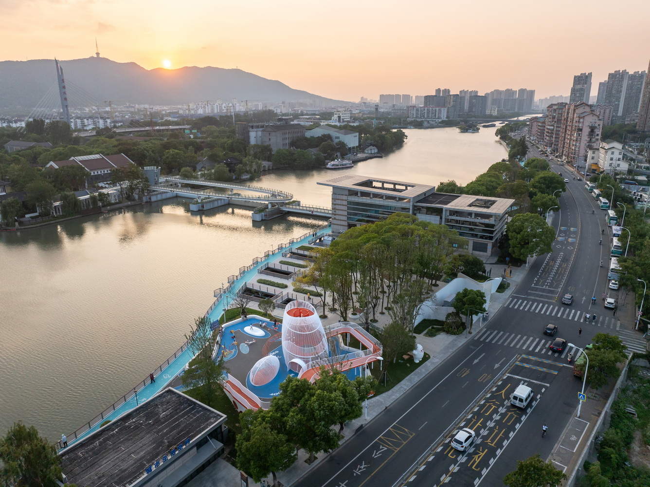 - Water Conservancy Hub: The Jiangjian Water Conservancy Hub is one of the eight major control structures in Wuxi's East Canal Encirclement. The overall planar design utilizes the space above the water of the inlet and outlet channels of the right bank pump station for green landscaping, integrating it with the landscape belt on the right bank. The original planar design was shaped like a "fish," and a cylindrical building named 'The Granary of the World' was placed on the left bank shoreline, continuing the historical 'Rice Market' culture. In the design, in addition to ensuring the continuity of the integrated slow-traffic path, all spaces are opened up as much as possible, and corresponding cultural and landscape functions are integrated.