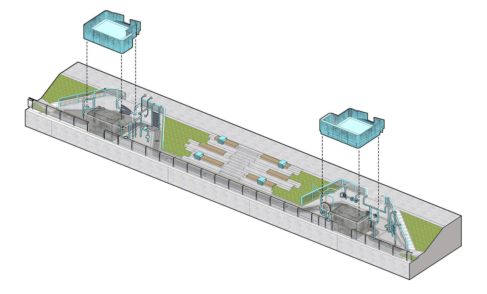 - Understory Museum: The understory space south of the hub is opened up to form an accessible leisure plaza, and the enclosure for the transformer box is transformed into an exhibition wall for water conservancy facility construction, creating an open micro-museum.