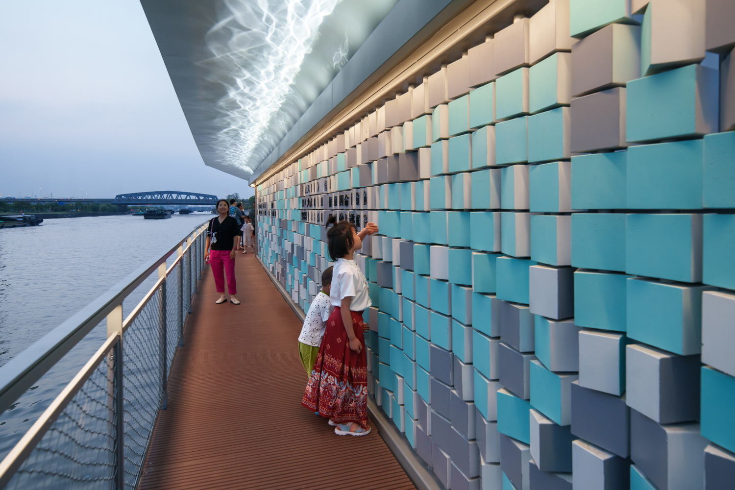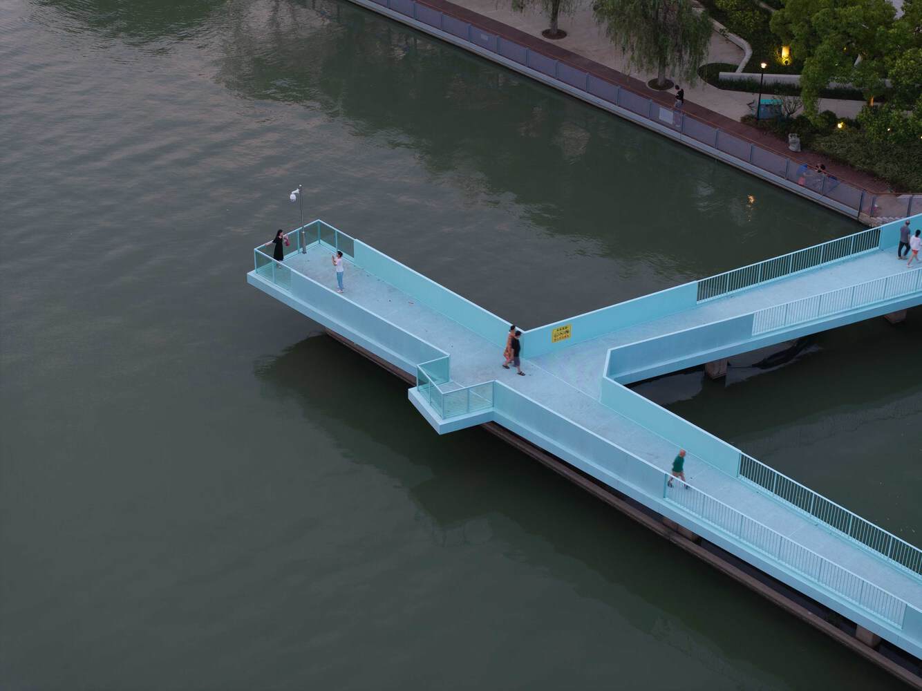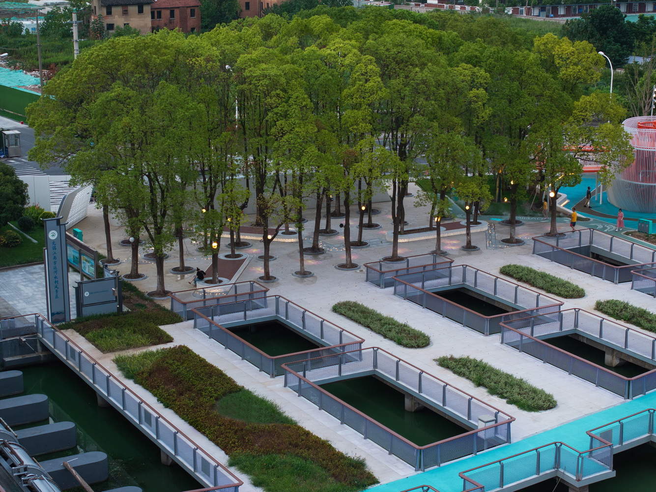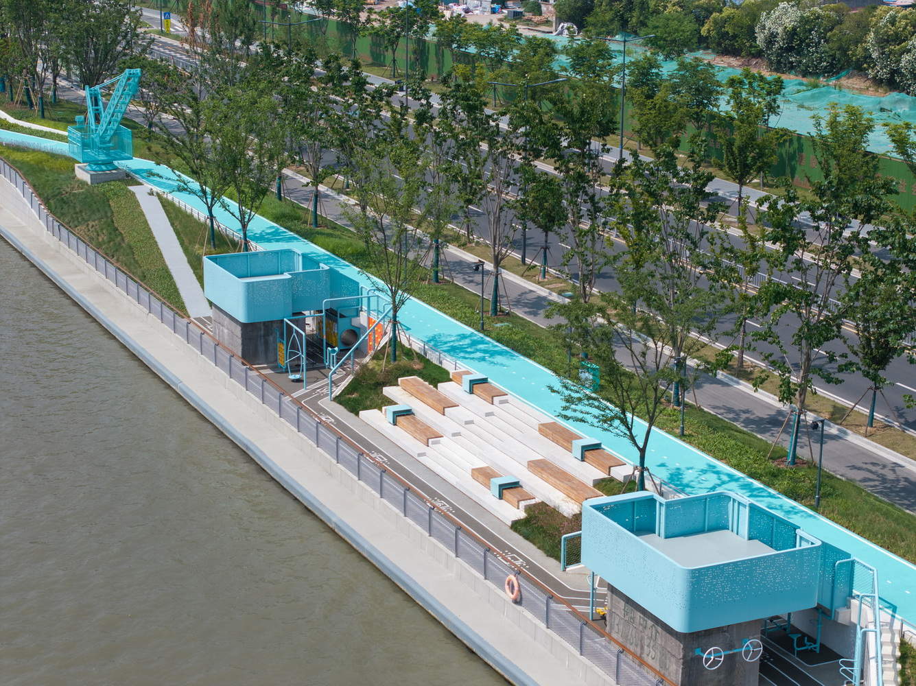 -水上漫步道: 水利枢纽北侧原生植被较好,更新主要以慢行道贯通为主。同时将原有水上平台一并结合考虑,形成水利枢纽侧新的水上蓝色漫步道,平台处可以近看运河、远观惠山,变成了新的打卡点。