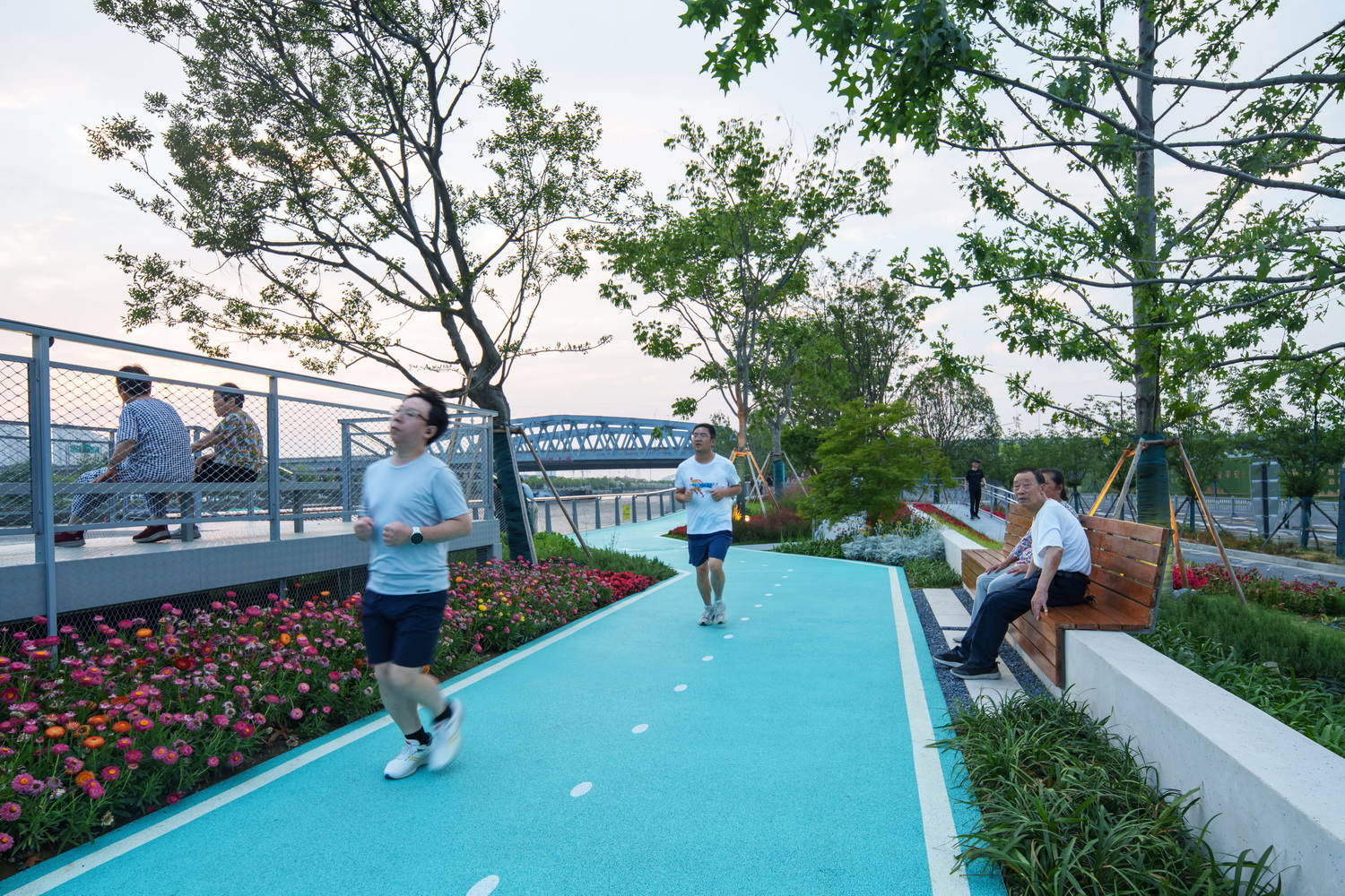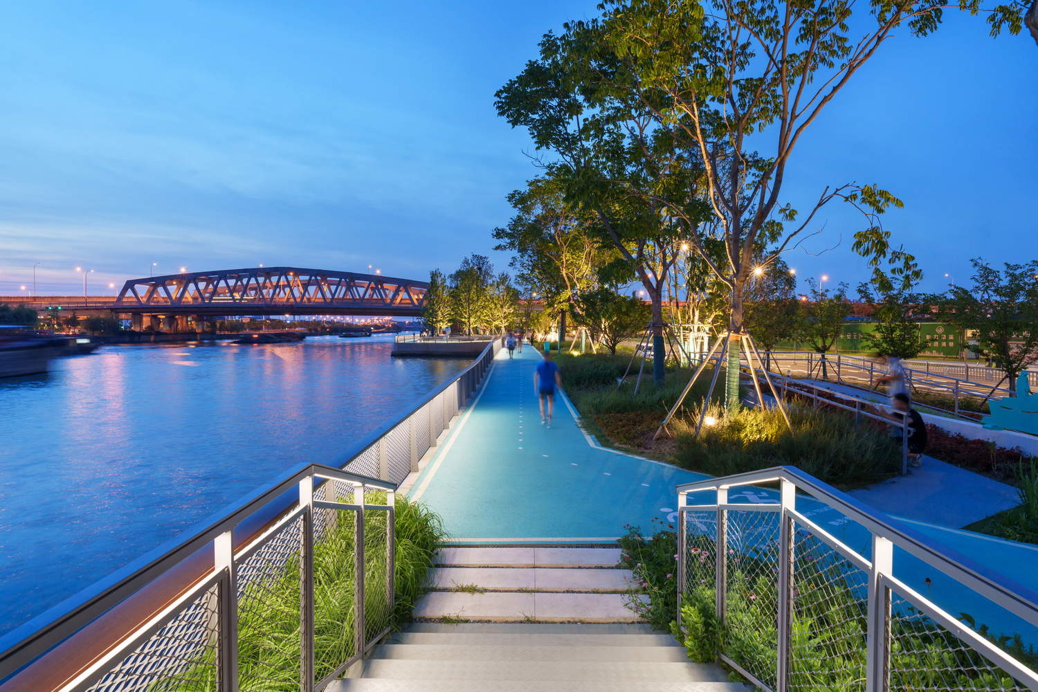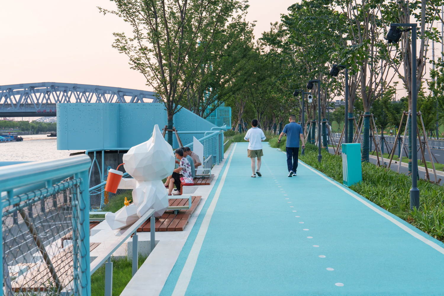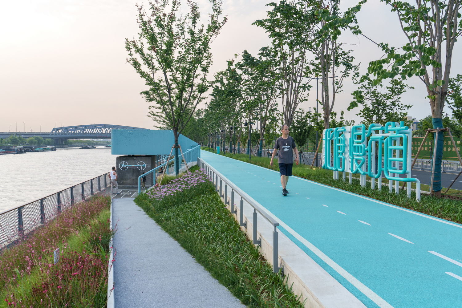 滨水空间策略的精妙平衡:该项目在3.6公里的狭长滨水地带,成功平衡了新建、更新以及亲水性与防汛安全之间的复杂关系。通过“更新与新建”策略,针对不同段落的现状采取差异化设计,同时巧妙利用防汛墙的退让与渗透性,最大限度保障了连续、舒适的慢行系统。尤其在空间受限处,通过抬高步道利用防汛墙宽度拓展通行空间,体现了对城市基础设施约束条件下的高超设计智慧和对使用者体验的极致追求。