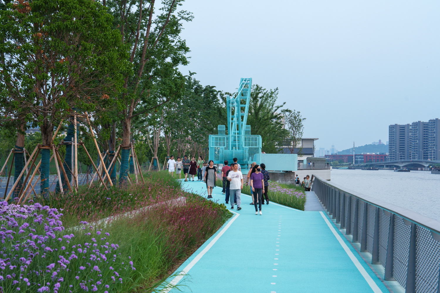 历史记忆与城市活力的有机融合:设计深刻理解无锡“码头城市”的历史底蕴,将废弃的码头吊机承台、江尖水利枢纽等城市记忆元素转化为“林下博物馆”和文化标识展示。通过植入“米市文化”等核心IP,项目将原先功能单一的滨水空间转变为集文化展示、休闲健身、亲子娱乐于一体的复合活力区。这种对历史遗存的活化利用,有效重塑了运河的新城市记忆,使滨水空间具备了强大的文化吸引力和社区粘性。