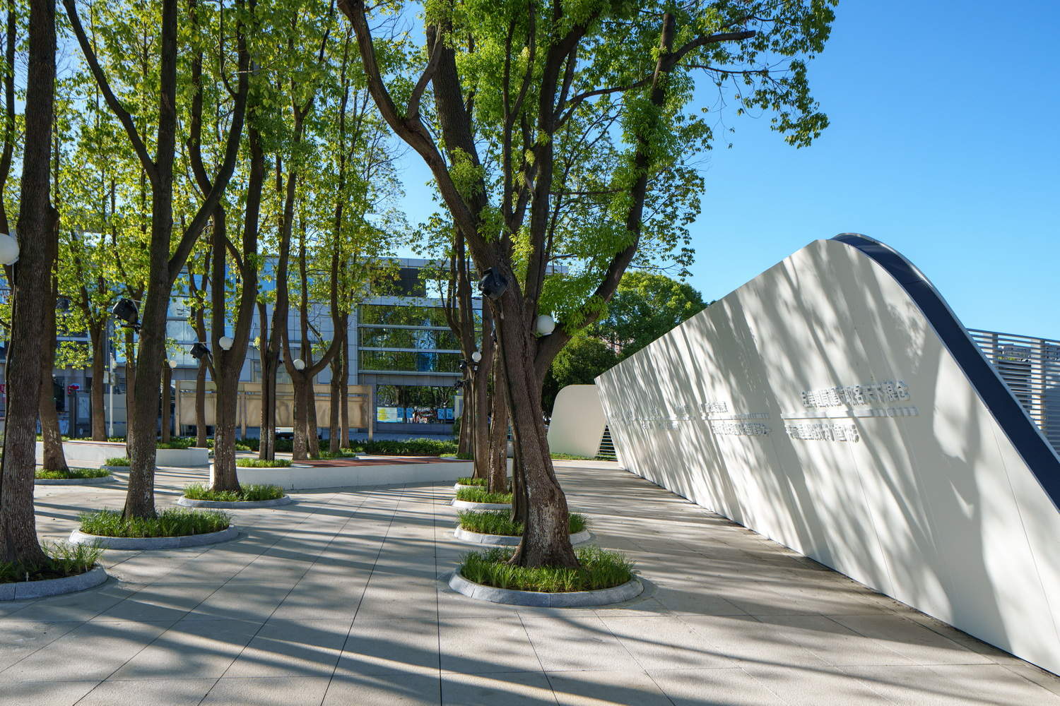 -林下博物馆: 枢纽南部开放林下空间,形成可进入式的休闲广场,并将变电箱的围挡营造成为水利设施建设展示墙,形成一个开放式的微型博物馆。