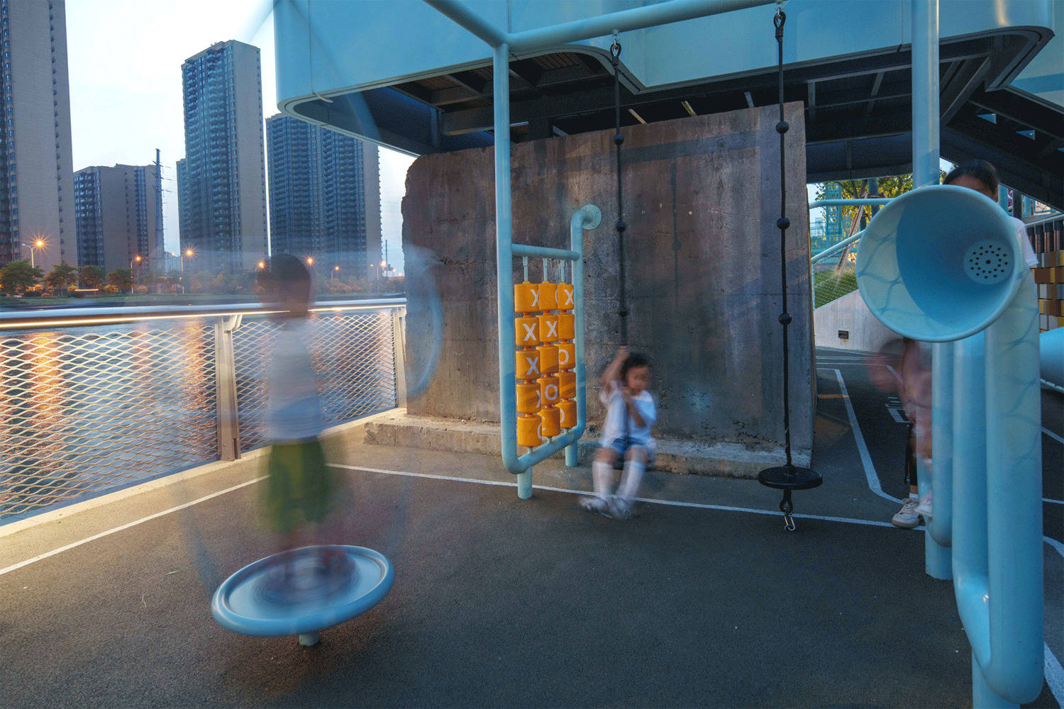04 城市友好的营建:-全龄友好: 从全龄友好的视角展开空间设计及功能布置,准确把握各年龄群体的日常需求与空间使用状态,使所有来到基地的人群,均能享受友好、健康、多元的滨水环境与服务。本项目根据现状条件设置了四处儿童及健身场地。